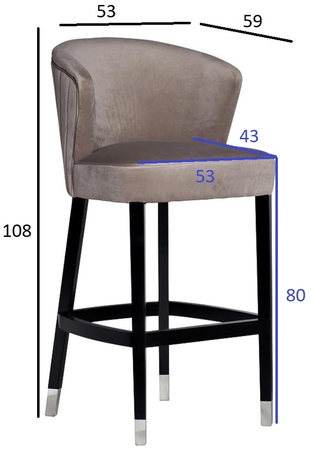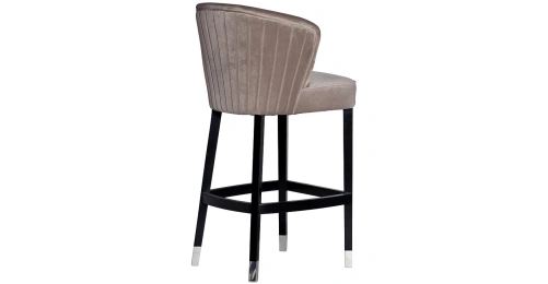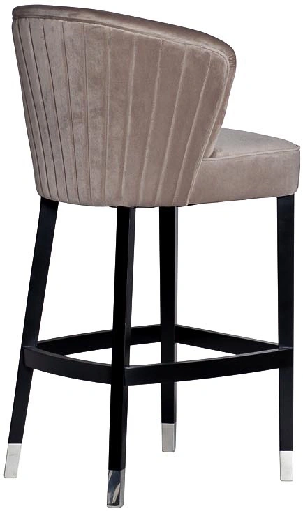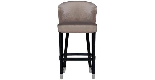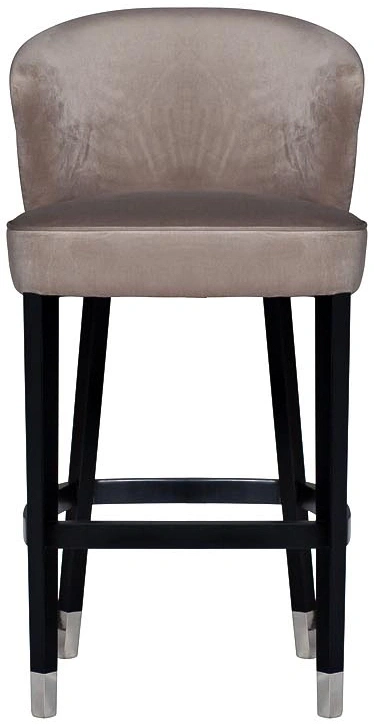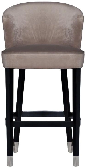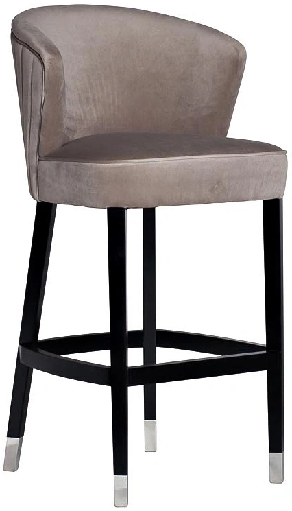 Элегантный барный стул с обивкой из велюра изысканного жемчужно-серого оттенка органично впишется как в классический, так и в ультрамодный интерьер ресторана или частной кухни. Контрастное сочетание светлого велюра и черных ножек с серебристыми наконечниками, спинка с веерообразной прострочкой, отделка швов велюровым кантом в тон и удобная опора для ног придают барному стулу особый шик. Прочный деревянный каркас и износостойкий велюр обеспечивают его долговечность и надежность. Наполнитель пенополиуретан. Размеры сиденья: Г43*Ш53*В80см.
