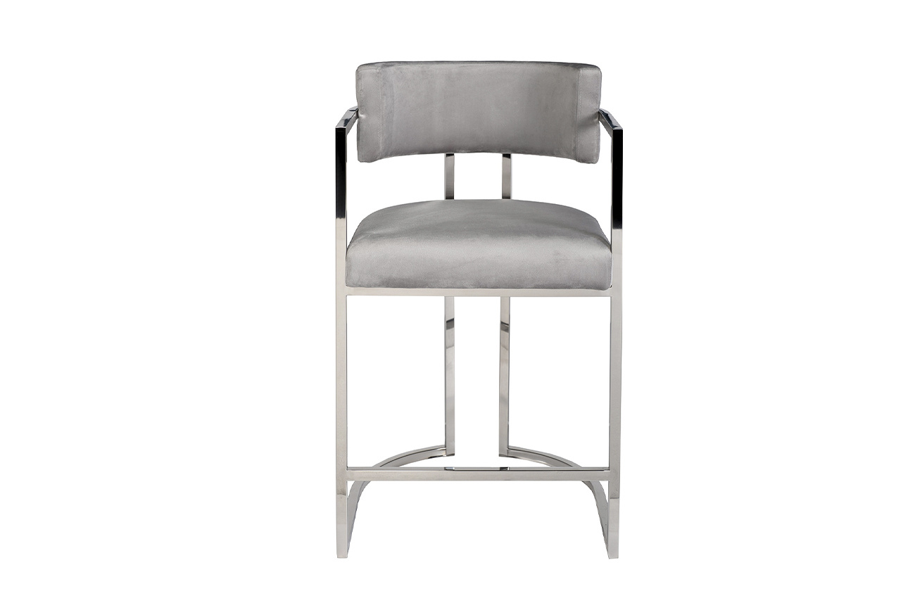 Дизайнерский барный серый стул с велюровой обивкой – стильное решение для обеденной зоны, кухни, столовой, студии с барной стойкой. Он прекрасно впишется в современные интерьеры ар-деко, минимализм, авангард, неоклассика, лофт, фьюжн. Сочетание дорогого велюра и блестящего металла придает модели особенного шика. При этом барный стул на металлическом каркасе весьма удобный в эксплуатации за счет небольшой спинки, подлокотников и ступеньки для ног. Компания Garda Decor предлагает купить велюровый барный стул с доставкой, а также другую первоклассную мебель и предметы декора в стилистике современного ар-деко. Глубина сиденья 50см, высота от пола 60см