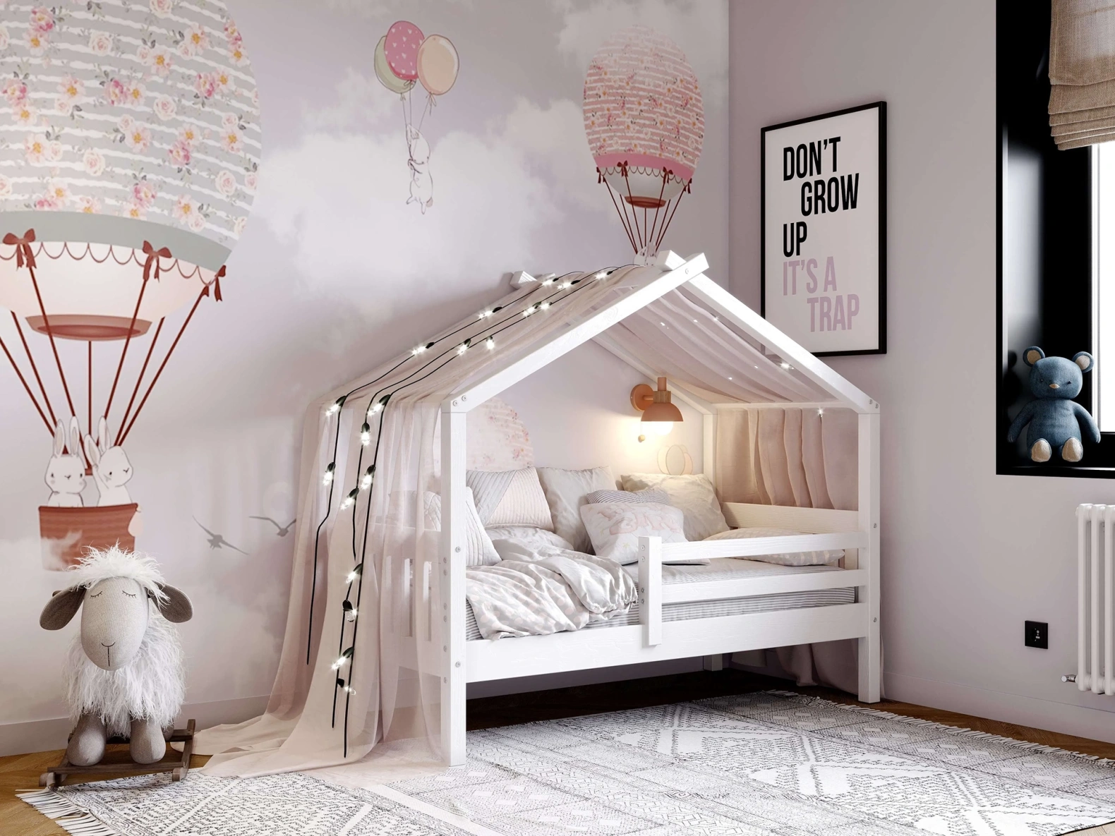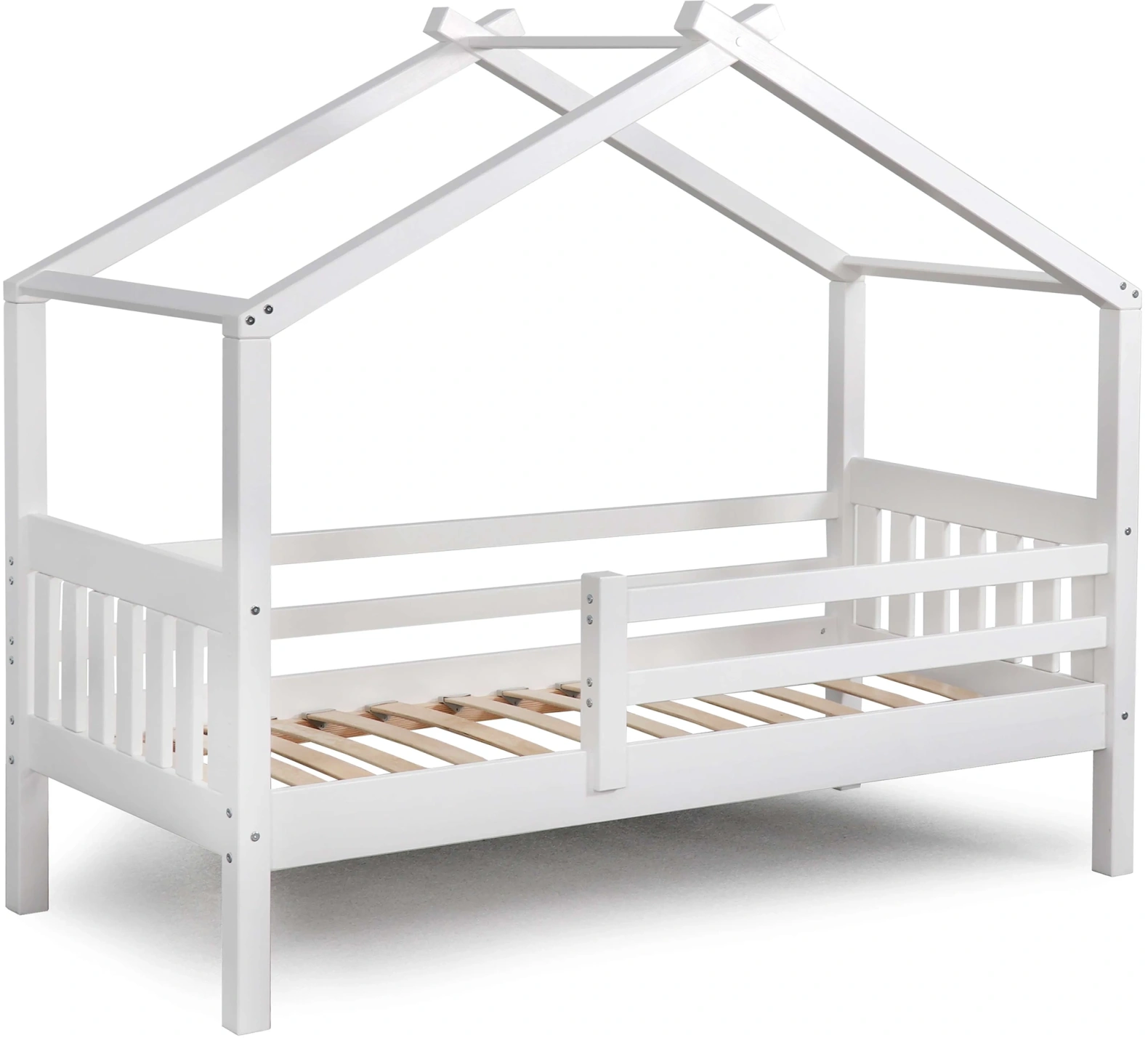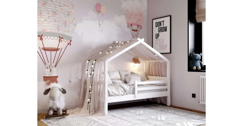 Каркас укомплектован основанием из поперечных гнутых ламелей. Головная и ножная спинки соединены стропилами, образующими крышу, благодаря чему малыш будет ощущать себя в собственном уютном домике. В комплектацию кровати входит ортопедическое основание из гнутоклееных ламелей.