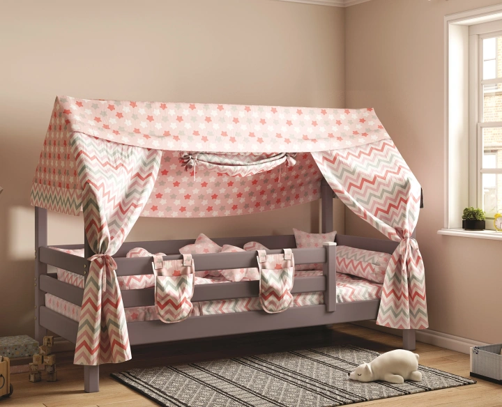 Уложить разыгравшегося ребенка бывает непросто – справиться с этой задачей поможет кроватка "Соня" с надстройкой в виде крыши домика. Дополненный текстильными элементами балдахин создает ощущение безопасности, настраивает на спокойствие, а в дневное время – может служить декорациями для пробуждающих воображение игр. Бортик по периметру защищает от случайного падения во сне.