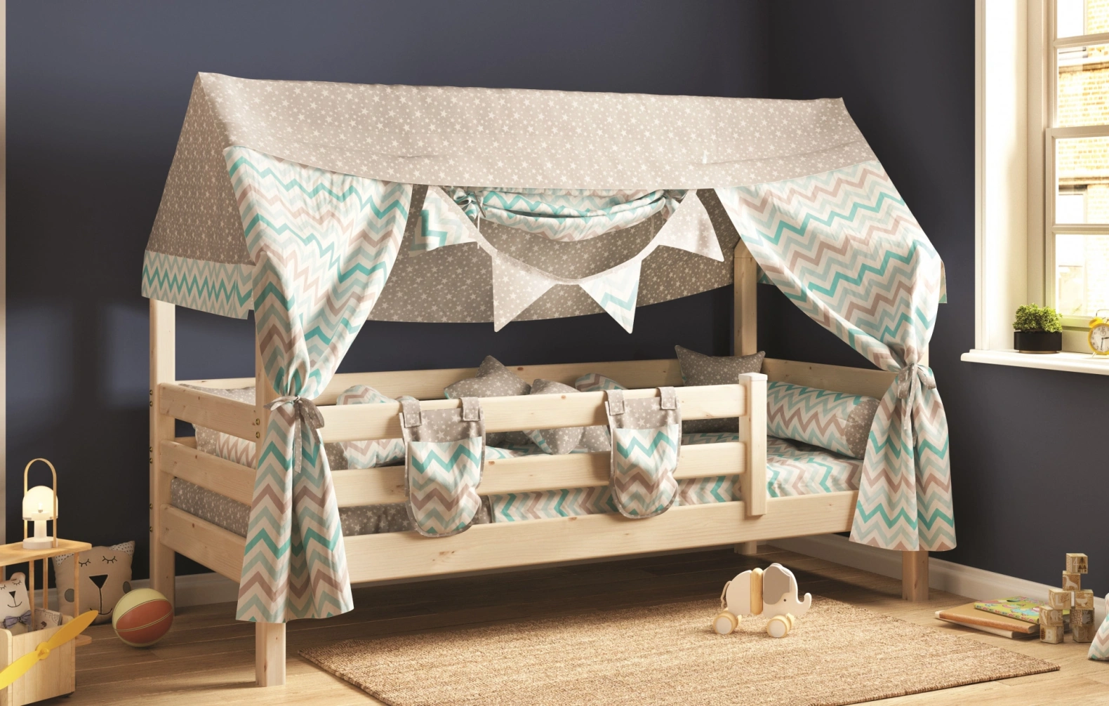 Уложить разыгравшегося ребенка бывает непросто – справиться с этой задачей поможет кроватка "Соня" с надстройкой в виде крыши домика. Дополненный текстильными элементами балдахин создает ощущение безопасности, настраивает на спокойствие, а в дневное время – может служить декорациями для пробуждающих воображение игр. Бортик по периметру защищает от случайного падения во сне.