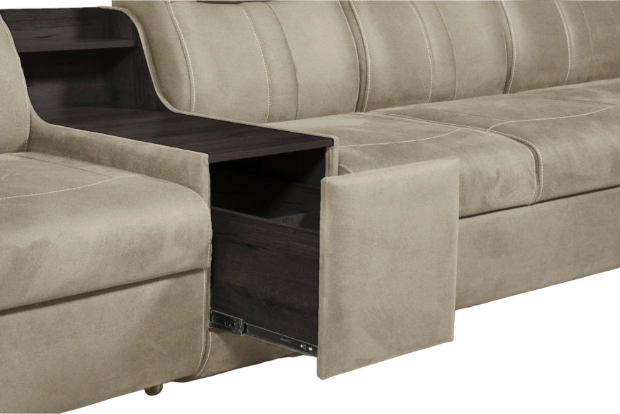 Модульный диван с ровным спальным местом и баром справа. Имеет 2 разных функционала. Несмотря на офисный строгий вид этот диван имеет спальное место, пригодное для ежедневного раскладывания.