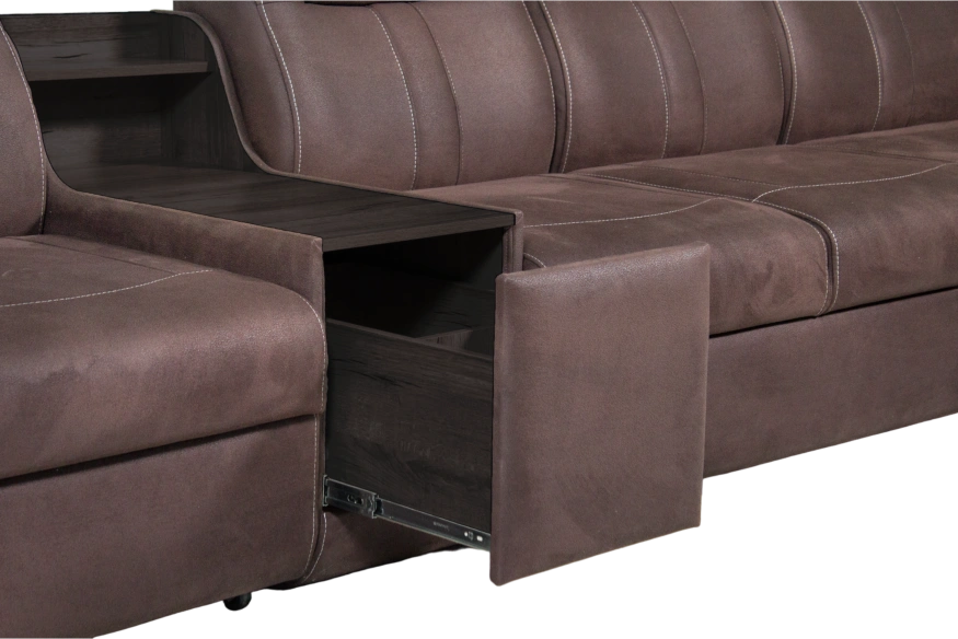 Модульный диван с ровным спальным местом и баром справа. Имеет 2 разных функционала. Несмотря на офисный строгий вид этот диван имеет спальное место, пригодное для ежедневного раскладывания.