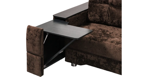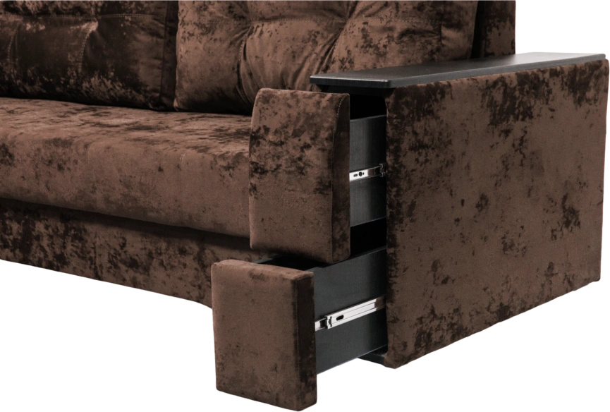 Диван из серии Атлант с современным дизайном, МДФ декором и удобным механизмом раскладывания. Модель выполнена на металлическом каркасе с наполнителем пенополиуретан, который выдерживает высокие нагрузки и быстро восстанавливает форму. Особенность модели - выдвижные ящики для хранения в подолкотниках. Раздвижной столик в стандартных комплектациях идет слева, на заказ можно изготовить столик справа.