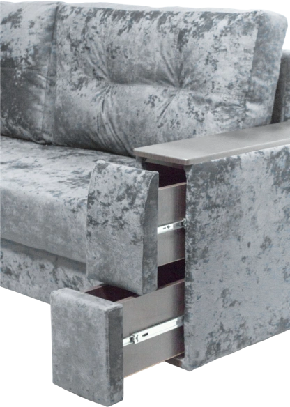 Диван из серии Атлант с современным дизайном, МДФ декором и удобным механизмом раскладывания. Модель выполнена на металлическом каркасе с наполнителем пенополиуретан, который выдерживает высокие нагрузки и быстро восстанавливает форму. Особенность модели - выдвижные ящики для хранения в подолкотниках. Раздвижной столик в стандартных комплектациях идет слева, на заказ можно изготовить столик справа. Модель подходит к интерьеру в цвете венге за счет подлокотников. Стандартная модификация идет со столом слева, но на заказ столик можно изготовить справа.