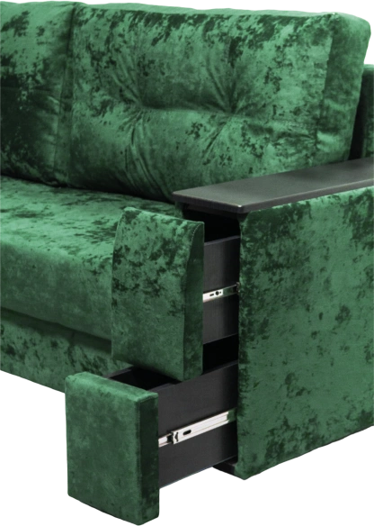 Диван из серии Атлант с современным дизайном, МДФ декором и удобным механизмом раскладывания. Модель выполнена на металлическом каркасе с наполнителем пенополиуретан, который выдерживает высокие нагрузки и быстро восстанавливает форму. Особенность модели - выдвижные ящики для хранения в подолкотниках. Раздвижной столик в стандартных комплектациях идет слева, на заказ можно изготовить столик справа.