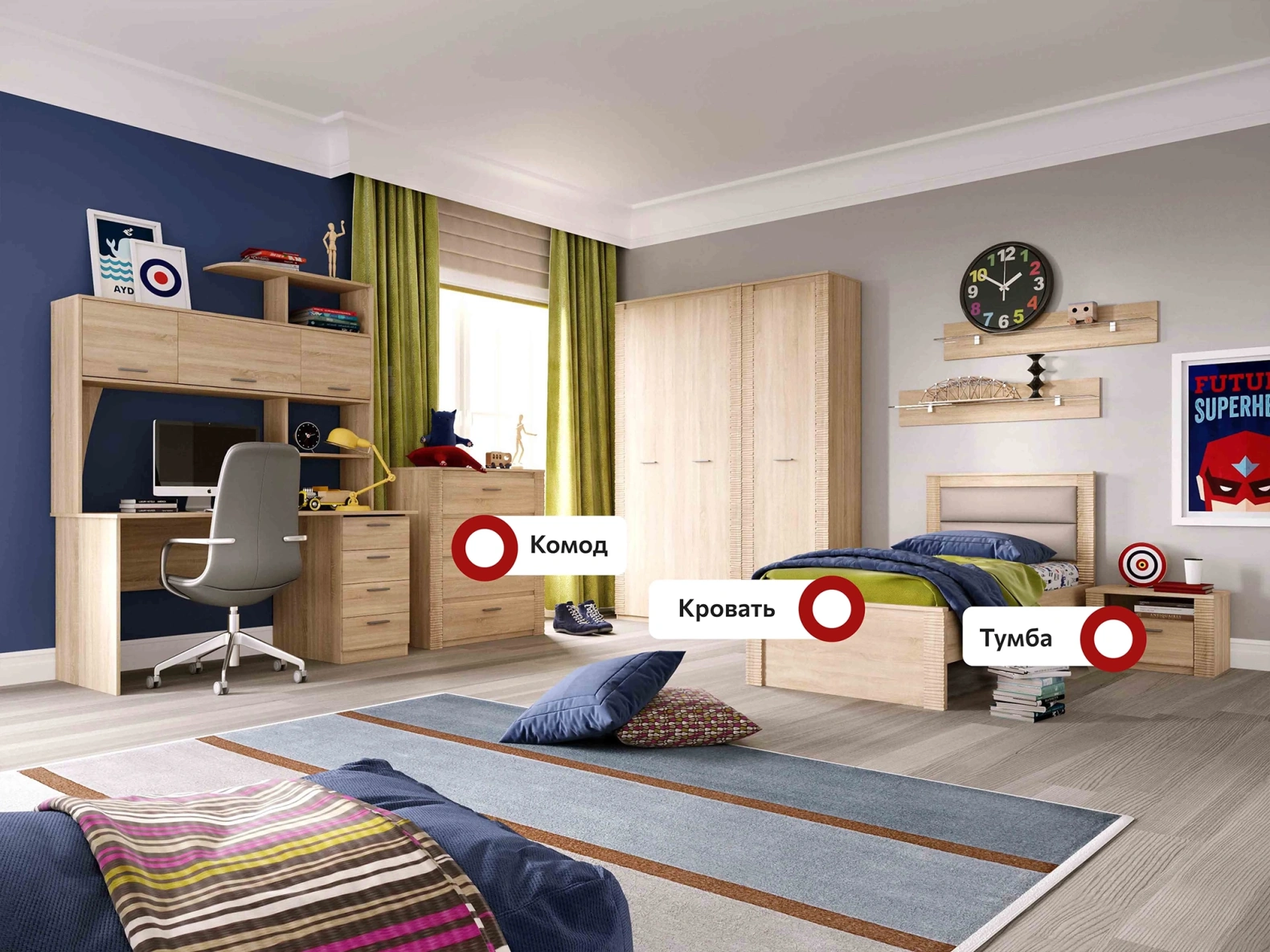 В состав коллекции входят: шкаф однодверный, шкаф угловой, шкаф двухдверный, комод, стол компьютерный, тумба прикроватная, кровать.