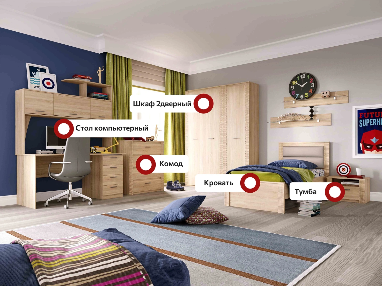 Кровать, Тумба, Комод, Шкаф, Стол компьютерный