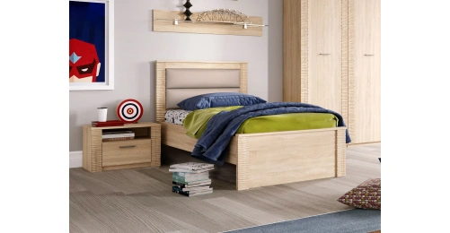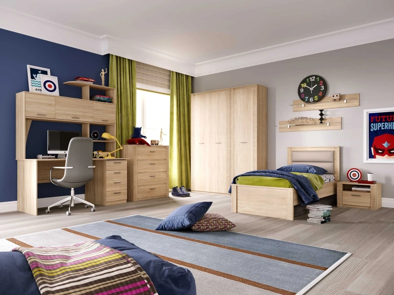 В состав коллекции входят: шкаф однодверный, шкаф угловой, шкаф двухдверный, комод, стол компьютерный, тумба прикроватная, кровать.