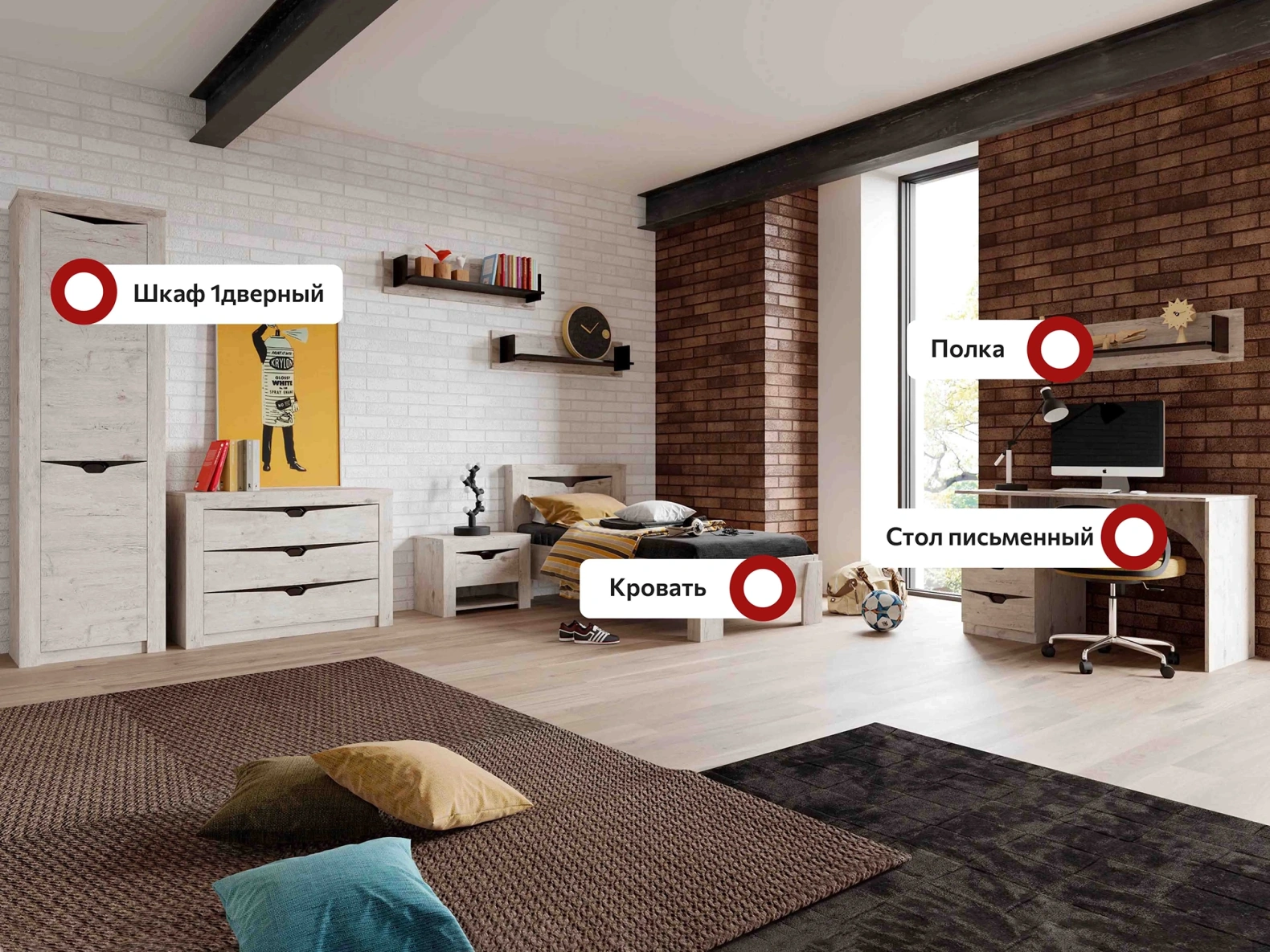 "Соренто" молодёжная — один из примеров идеального сочетания практичности, оригинальности и долговечности. Цветовое исполнение подходит сразу для нескольких стилей, а габариты — для комнат разной площади.