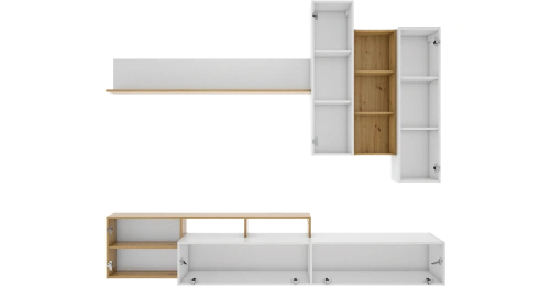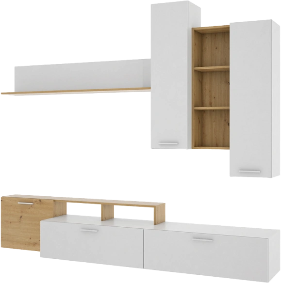 Корпус гостинной изготовлен из 16 мм ламинированной древесностружечной плиты - цвет «Белый»и «Дуб Дикий». Видимые и невидимые части каркасов закромлены кромками полепропилен и ABS.