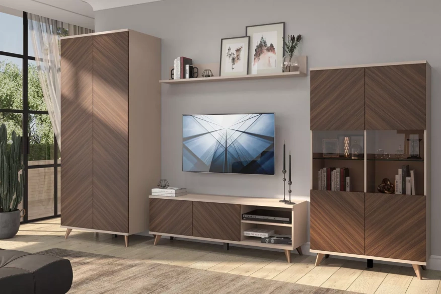 Гостиная Хармони - это воплощение стиля и комфорта. Элегантное сочетание бежевого корпуса и древесного фасада создаёт атмосферу гармонии и уюта в интерьере. Благодаря современным механизмам Push to Open дверцы открываются легко и бесшумно, обеспечивая удобство использования и сохраняя эстетичный внешний вид мебели.