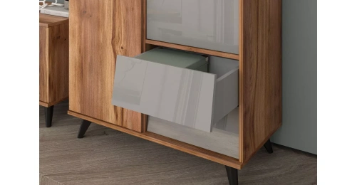 «Дуб Барокко Янтарный» и «Серый Асфальт» . Торцевые поверхности корпуса закромлены кромками ПВХ и ABS. Детали, изготовленные из плиты