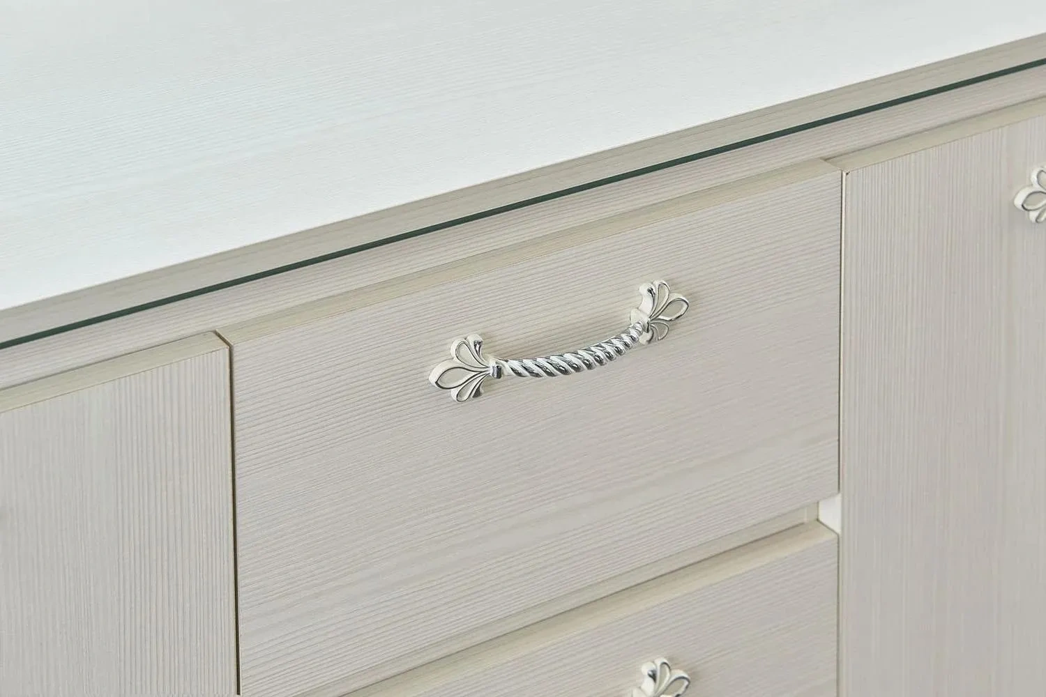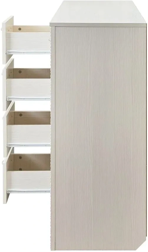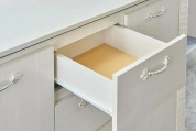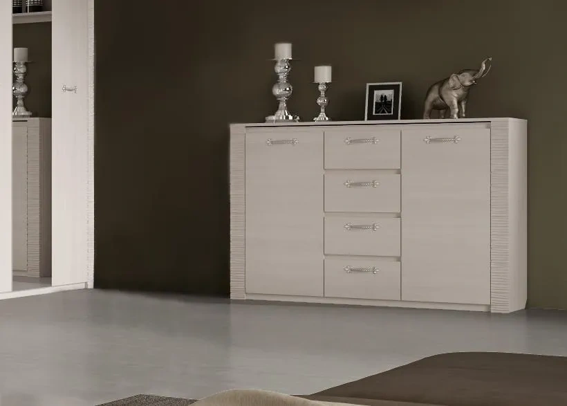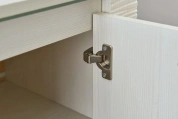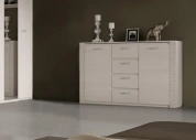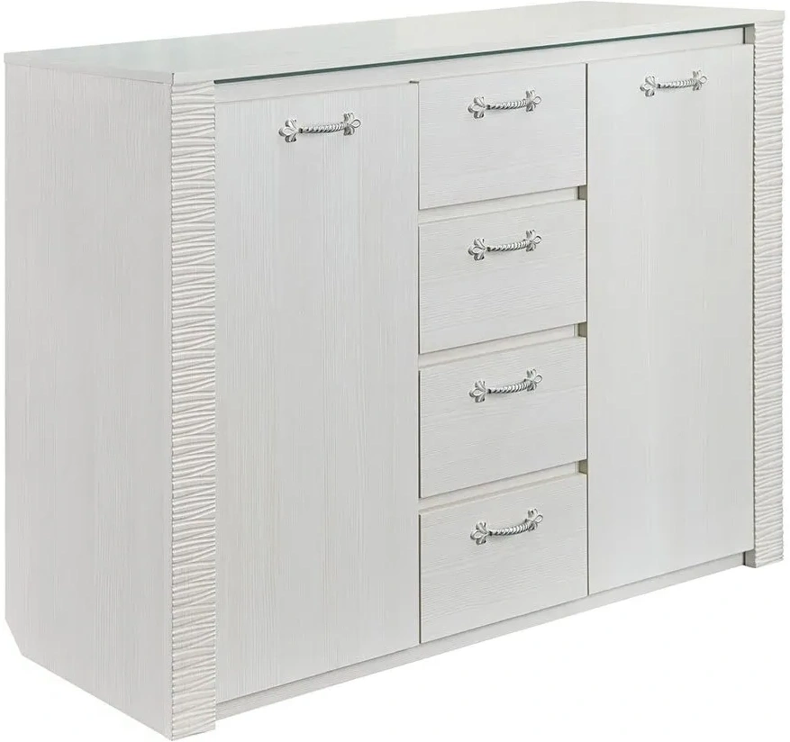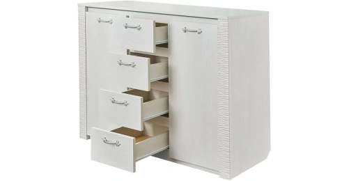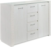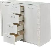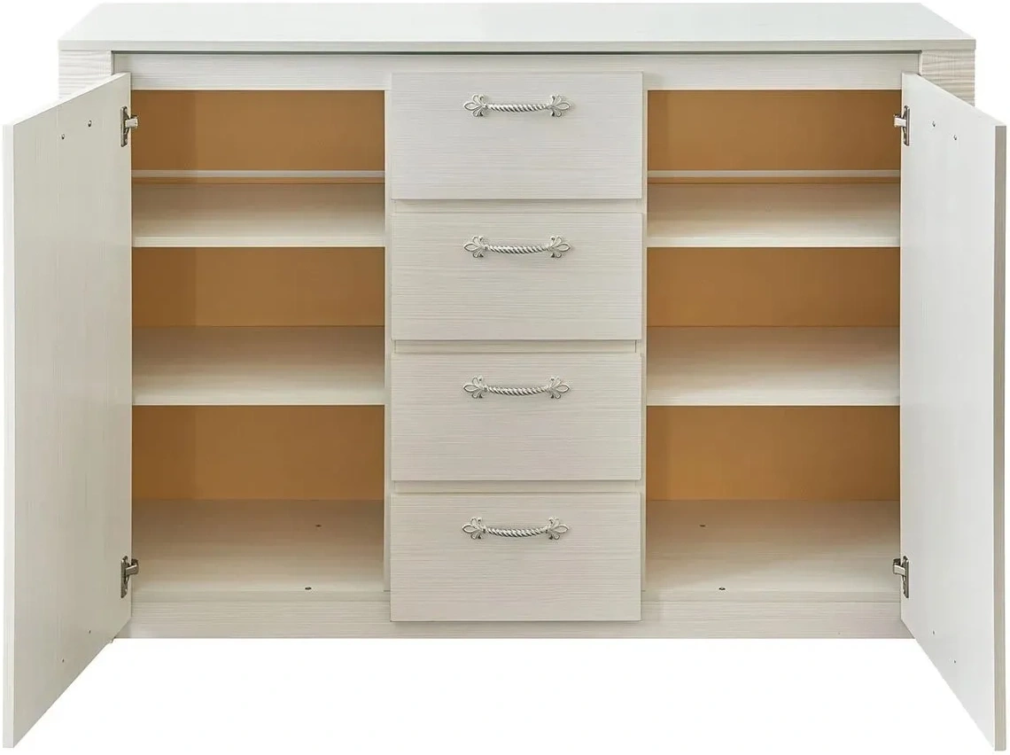 Комод оснащен четырьмя выдвижными ящиками на роликовых направляющих и двумя вместительными отделениями за распашными дверцами.