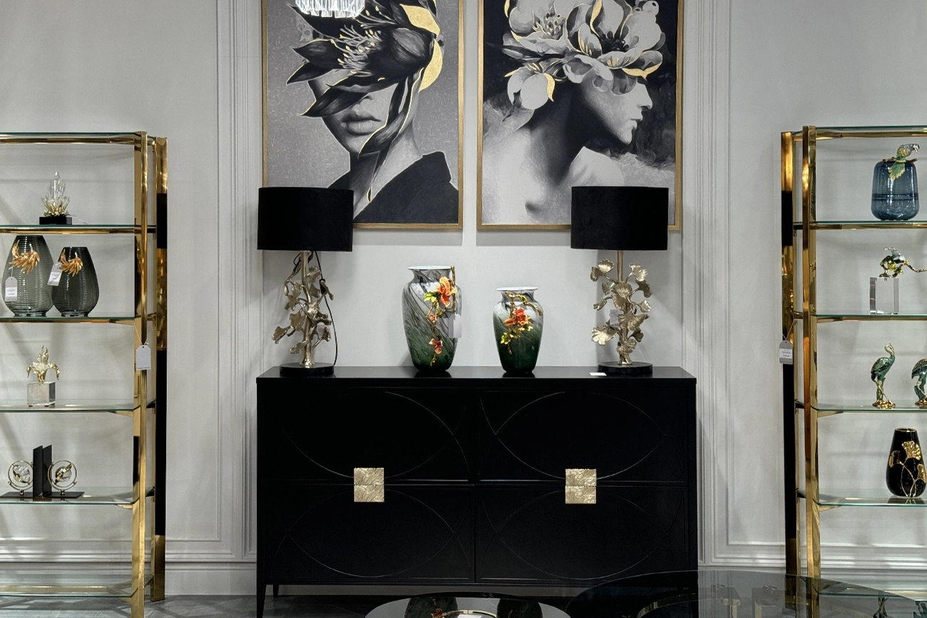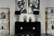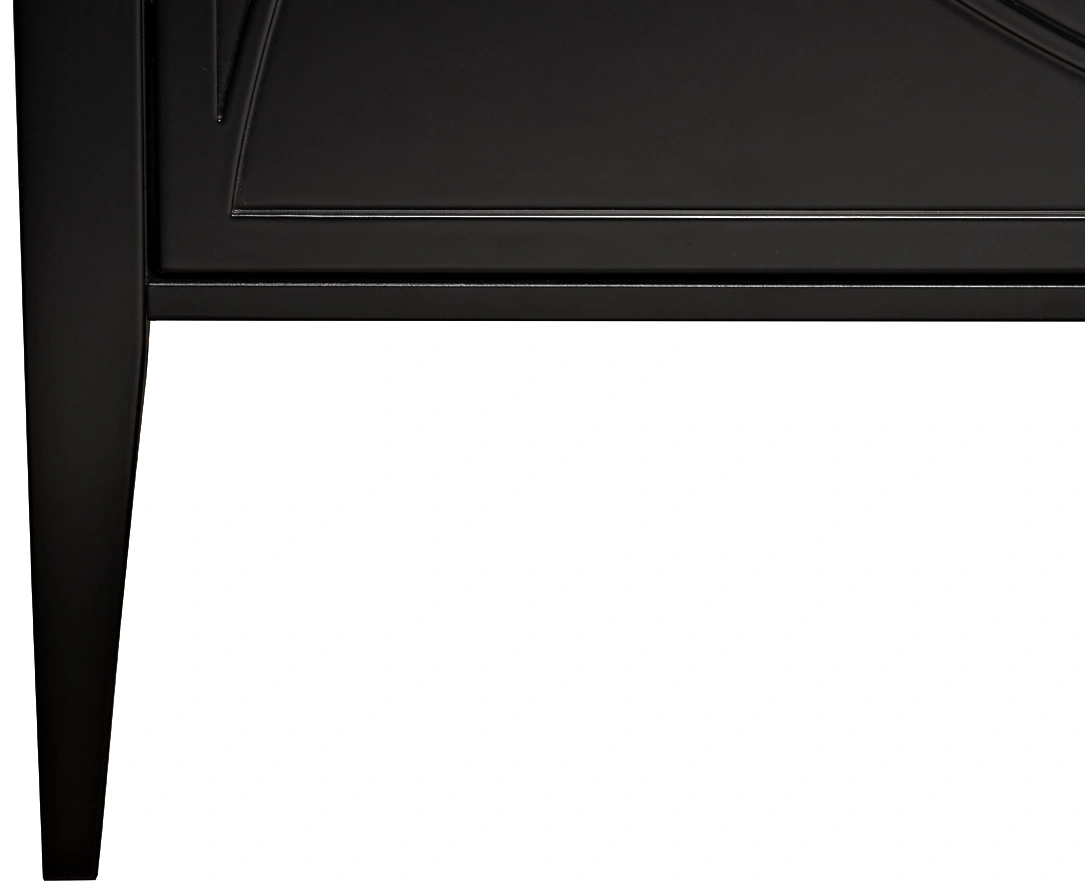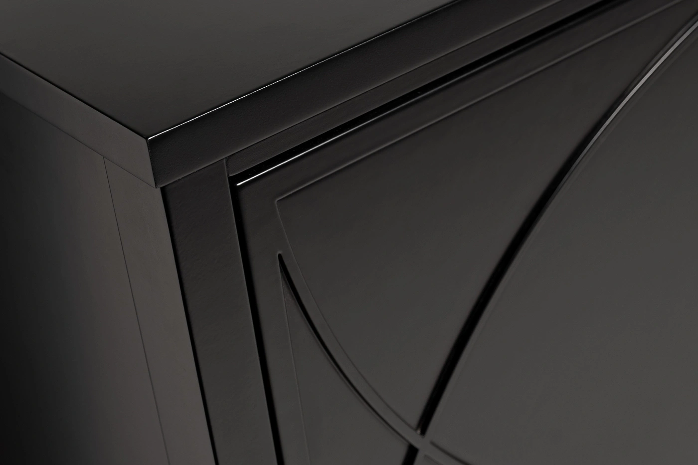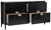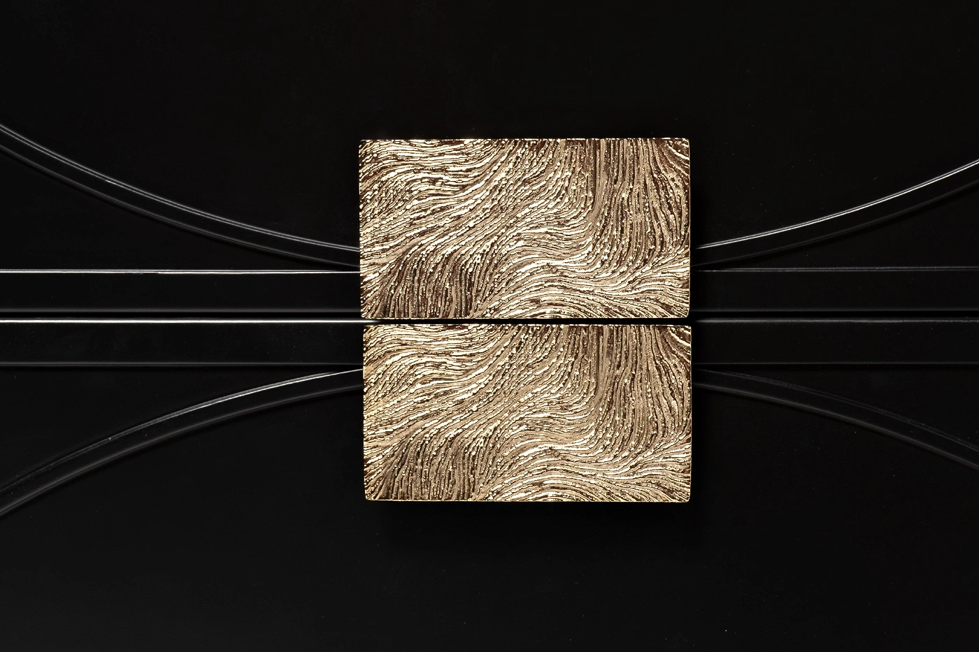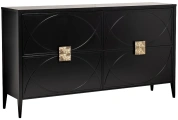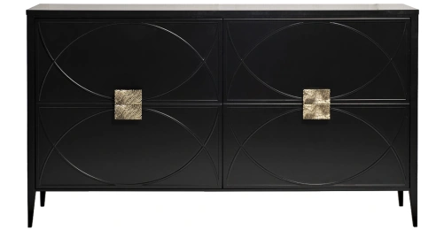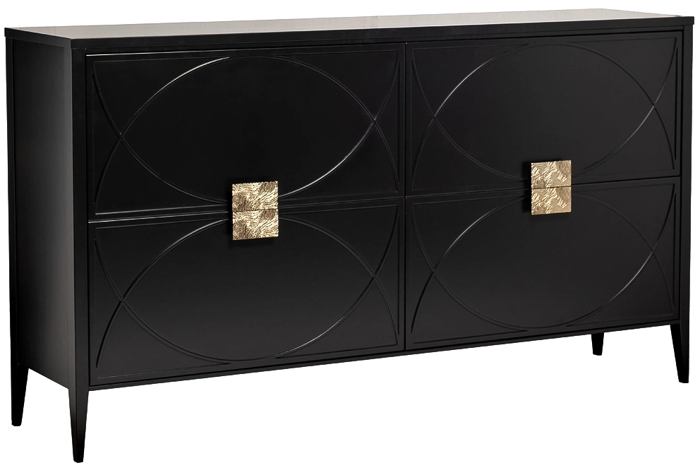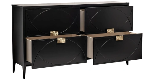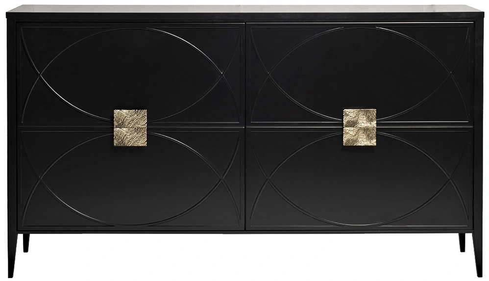 Дизайнерский комод в стиле ар-деко - авторская разработка дизайн-студии Garda Decor. Черный матовый фасад украшен объемным дугообразным декором и широкими рельефными ручками золотого цвета. Четыре выдвижных ящика прекрасно подойдут для хранения белья, одежды и прочих вещей. Тонкие ножки придают конструкции легкость и изящество. Эксклюзивный комод станет гармоничным дополнением интерьера спальни или гостиной.