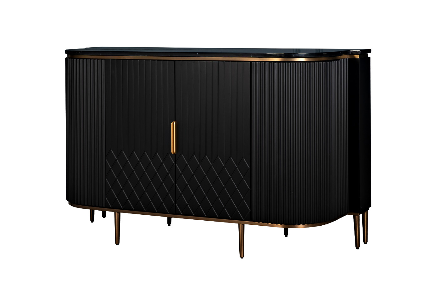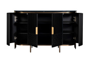 Изысканный черный комод с округлыми формами станет настоящим украшением гостиной или столовой в стиле ар-деко. Рельефные фасады с геометричным узором, напоминающим огранку драгоценного камня, приковывают взгляд и подчеркивают роскошный характер мебели. Изящные ножки и окантовка цвета благородной латуни гармонично сочетаются с глубоким черным цветом корпуса, создавая атмосферу респектабельности и лоска. Прочная столешница из черного стекла добавляет комоду функциональности и изысканности. Округлый комод — не только стильный, но и практичный предмет интерьера, который поможет поддерживать порядок в доме.