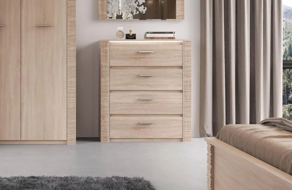 Комод оснащен четырьмя выдвижными ящиками на роликовых направляющих. Под столешницей имеется стеклянная панель (5 мм), предназначенная для установки светильника. Комплект подсветки (светильник и блок питания) приобретается отдельно. Блок питания рассчитан на подключение шести светильников.