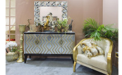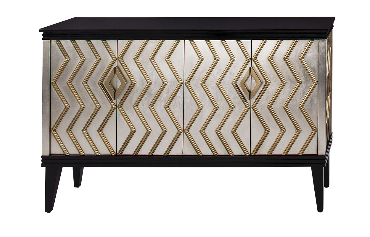 Дизайнерский комод ручной работы с геометрическим рисунком выполнен в духе биметаллической гостиной Форсайтов 10-х годов прошлого века. Фасад корпуса отделан тончайшей фольгой цвета старого золота и серебра и дополнительно прокрашен вручную по специальной технологии; тщательная отделка каждой детали придает ему особую индивидуальность. В комоде два отделения с вместительной полкой и четырьмя дверцами. На столешнице из натурального черного гранита будут великолепно смотреться вазы и изящные безделушки. Комод прекрасно впишется в интерьер в стиле ар-деко, богемный шик или фьюжн, добавляя артистизм и буржуазный лоск в обстановку.