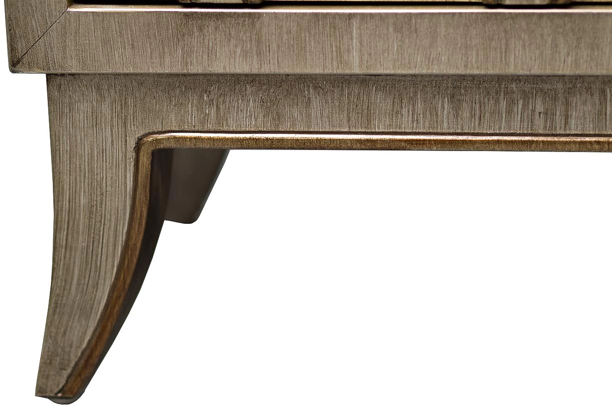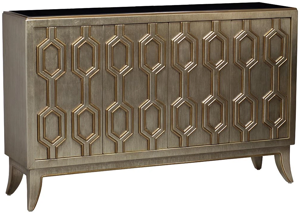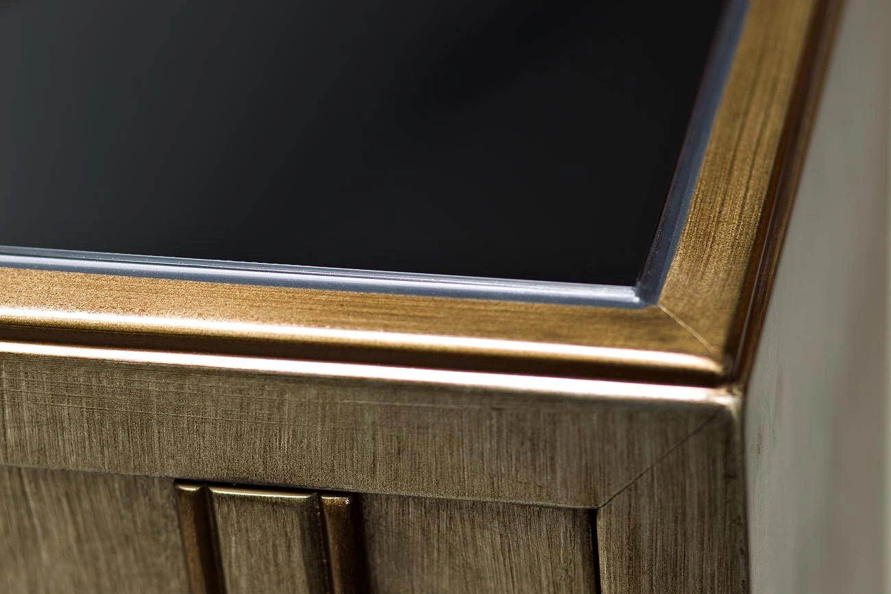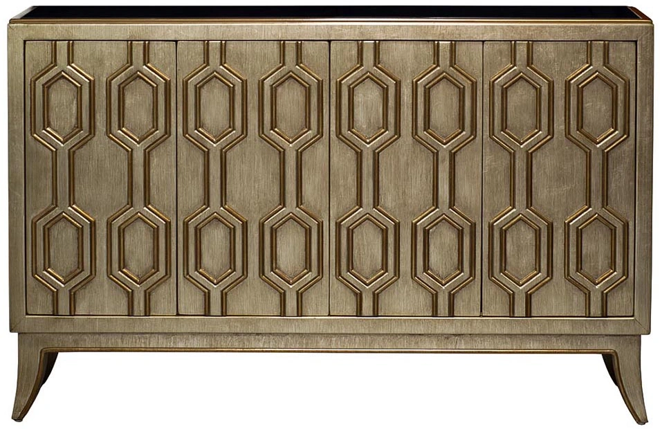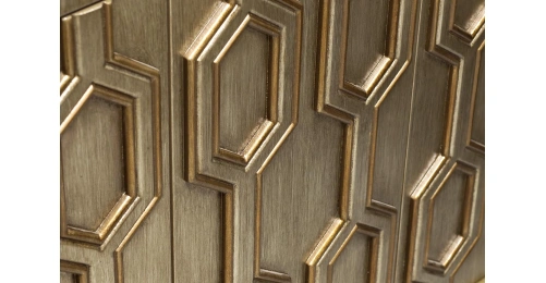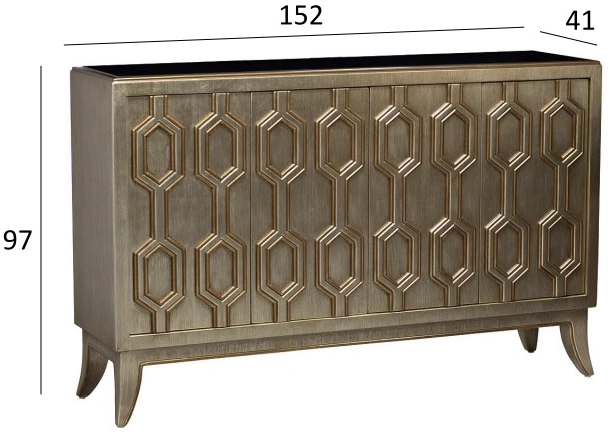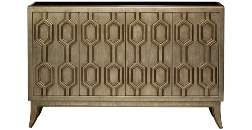 Роскошный дизайнерский комод цвета старого золота со столешницей из черного стекла изготовлен из МДФ. Фасад комода декорирован геометрическим узором в мавританском стиле, стилизованном под кованые сундуки, которые заменяли сарацинам мебель. Мавританский стиль приобрел особую популярность при императоре Бонапарте и получил новое прочтение в наши дни. Все детали поверхности обработаны и прокрашены в несколько слоев вручную по специальной технологии, что придает оттенкам выразительность и глубину, а комоду - характер и индивидуальность. Четыре дверцы открываются нажатием. Внутри комода имеется широкая полка. Комод в мавританском стиле прекрасно впишется в интерьер в стиле ар-деко, богемный шик или фьюжн, добавляя артистизма и буржуазного лоска в обстановку.