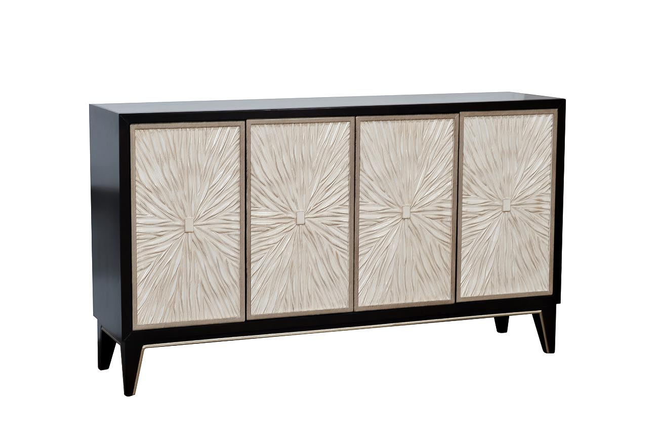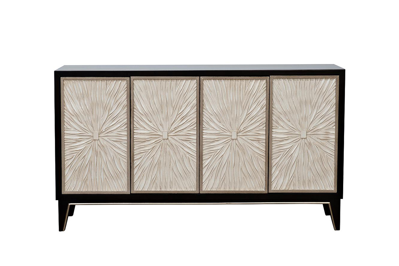 Изумительный дизайнерский комод насыщенного оттенка кофе эспрессо с дверцами цвета шампанского украсит вашу столовую, гостиную или спальную комнату. Уникальное покрытие фасада, выполненное вручную по авторской технологии, имитирует мягкие переливчатые складки ткани. Необыкновенное сочетание натурального дерева, металла и полимеров, изысканные цвета, тщательная отделка и многослойная прокраска вручную каждой детали делают комод настоящим произведением мебельного искусства. Четыре дверцы soft touch, открывающиеся при нажатии, дают доступ к двум вместительным отделениям с полкой. В комплект входит защитная стеклянная столешница. Комод прекрасно впишется в интерьер в классическом стиле, арт-деко, богемный шик или фьюжн.