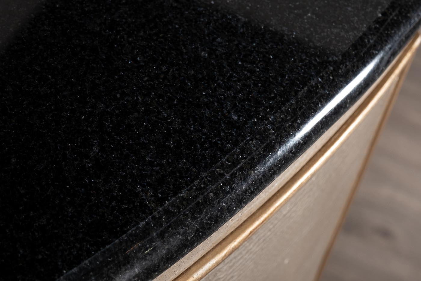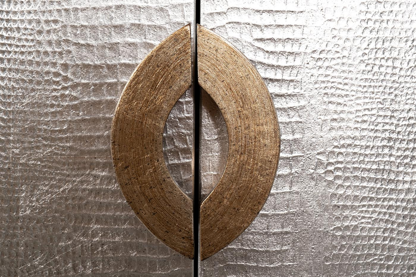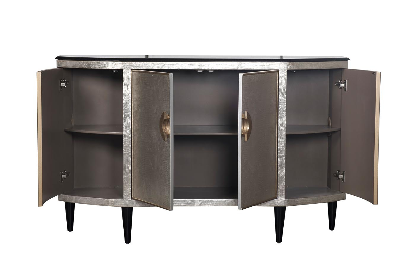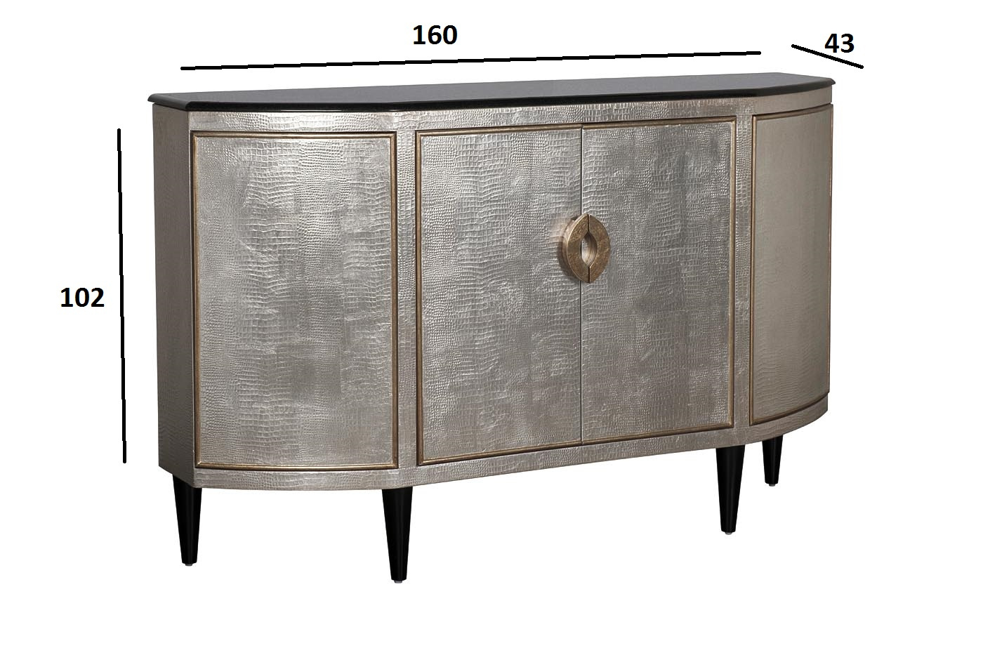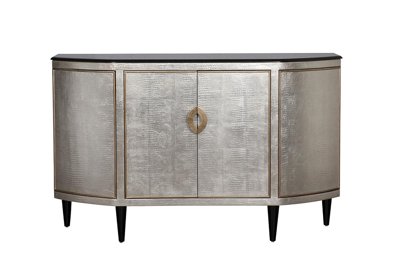 Великолепный дизайнерский комод украсит гостиную или спальную комнату. Корпус из дерева и МДФ имитирует кожу рептилии и покрыт тончайшими листьями фольги серебристого цвета. Дверцы фасада отделаны кантом и ручками цвета старого золота. Столешница из натурального черного гранита и черные ножки создают изысканный контраст с серебристым корпусом. В комоде два боковых и одно центральное отделение; внутри каждого отделения имеется вместительная полка. Боковые дверцы с механизмом touch-to-open открываются при нажатии, центральное отделение снабжено ручками и дополнительной магнитной защелкой. Корпус окрашен и залакирован вручную со всех сторон по уникальной авторской технологии; вы можете размещать его в любой части помещения. Мебель, отделанную тисненой кожей или ее имитацией, включают в свои коллекции ведущие мировые дизайнеры интерьеров. Комод подойдет незаурядным творческим личностям и прекрасно впишется в интерьер в стиле ар-деко, богемный шик или фьюжн.