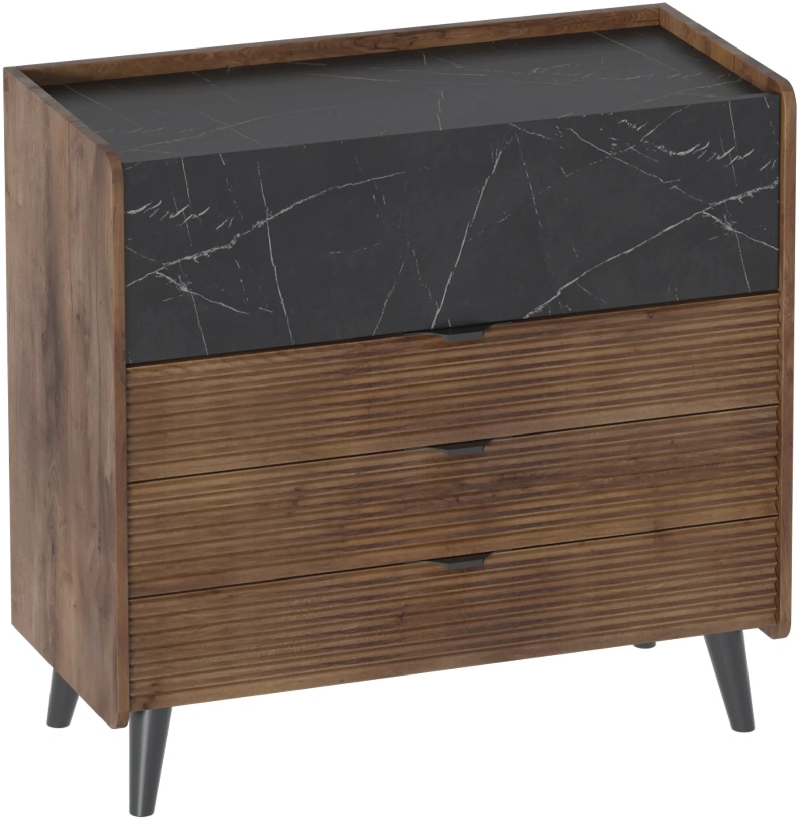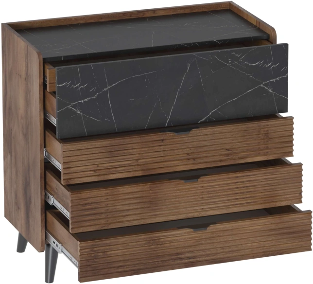 Привлекающий внимание легкостью и стильным оформлением, комод "Браун" не только украсит ваш дом, но и порадует своей функциональностью. Корпус комода и фасад большого ящика изготовлены из ЛДСП, декор на фасадах малых ящиков – из МДФ, стильные и устойчивые опоры - из массива березы.