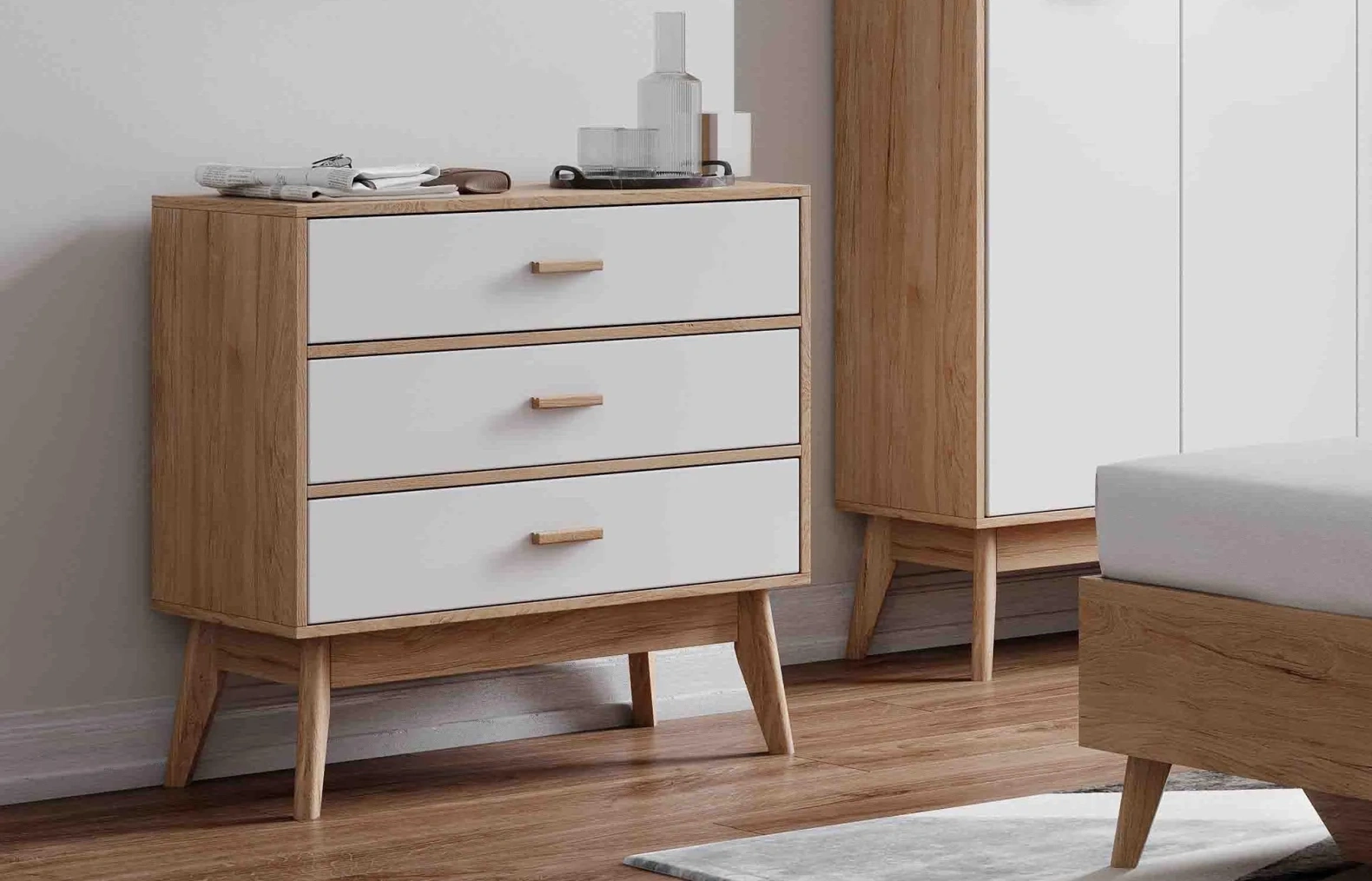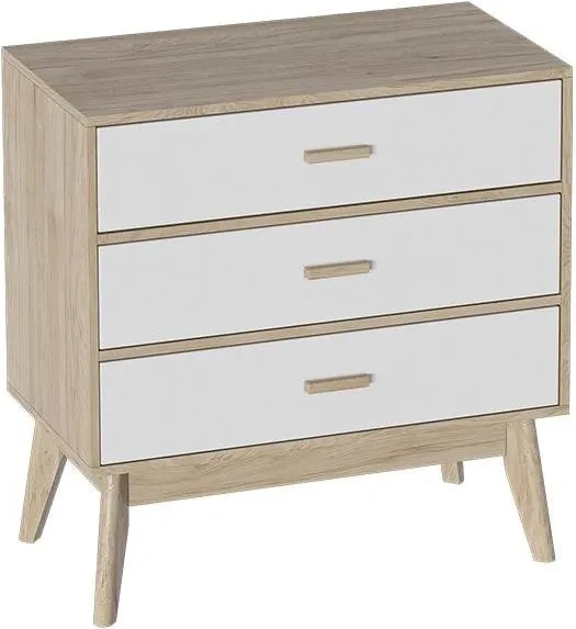 Привлекающий внимание легкостью и комфортом в использовании, комод "Калгари" не только украсит Ваш любимый скандинавский интерьер, но и порадует своей функциональностью. Каркас комода изготовлен из ЛДСП в цвет натурального дуба, фасады ящиков – из МДФ белого матового цвета, стильные и устойчивые ножки - из массива березы.