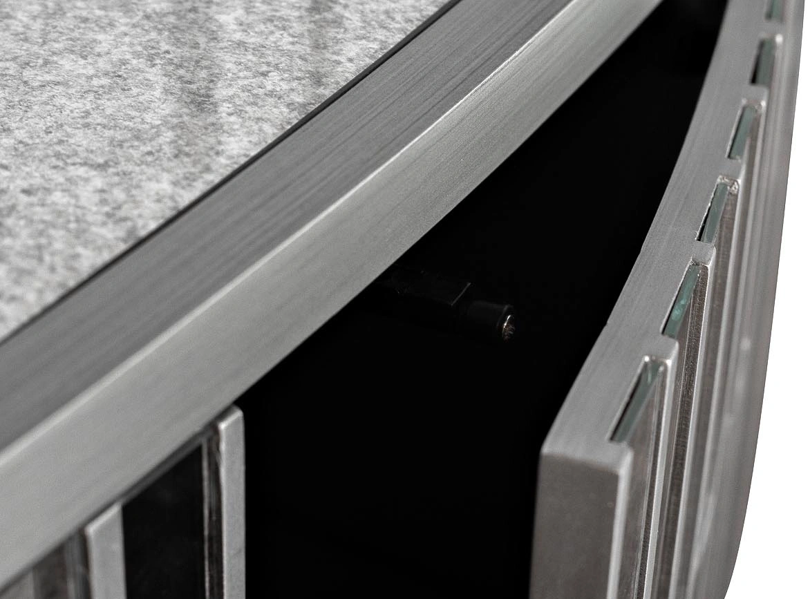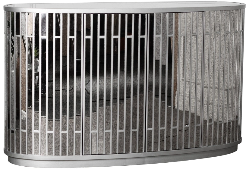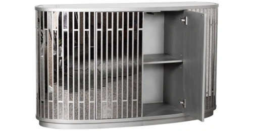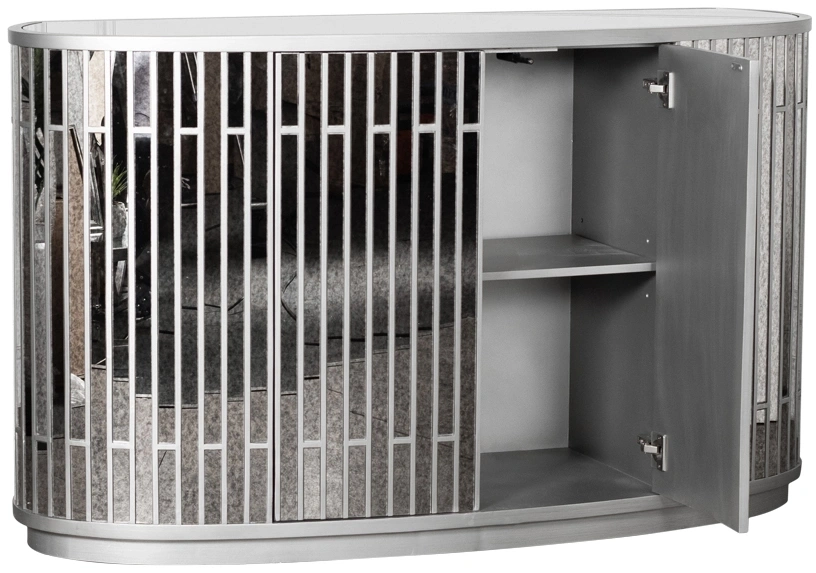 Необычайно изысканный и утонченный комод инкрустирован панелями из искусственно состаренного зеркала цвета silver antique и покрыт зеркальной столешницей того же оттенка. Все детали корпуса из дерева и МДФ серебристого цвета прокрашены и залакированы вручную в несколько слоев, что придает комоду особый шарм и обаяние. Две дверцы с механизмом push-to-open открывают доступ к внутреннему отделению с полкой. Зеркальная столешница может служить красивой подставкой для фоторамок, изысканных безделушек или туалетных принадлежностей. Комод прекрасно впишется даже в устоявшийся интерьер, дополнив меблировку изящной спальной или гостиной комнаты, а также элегантной прихожей.