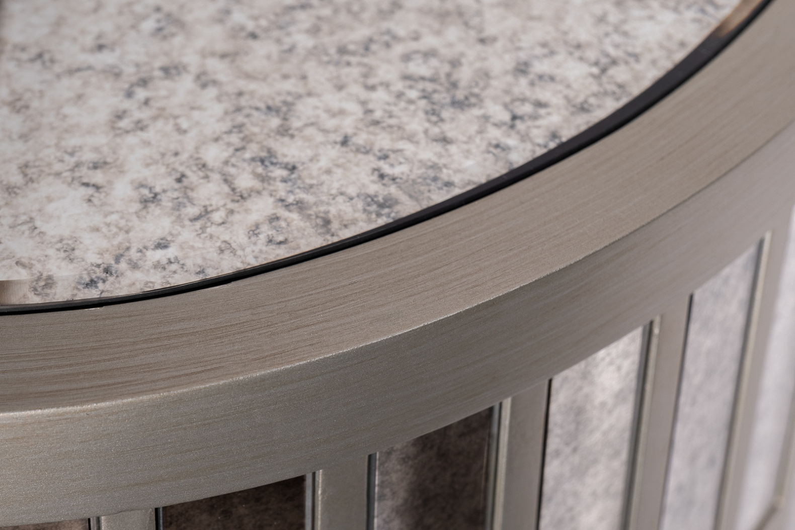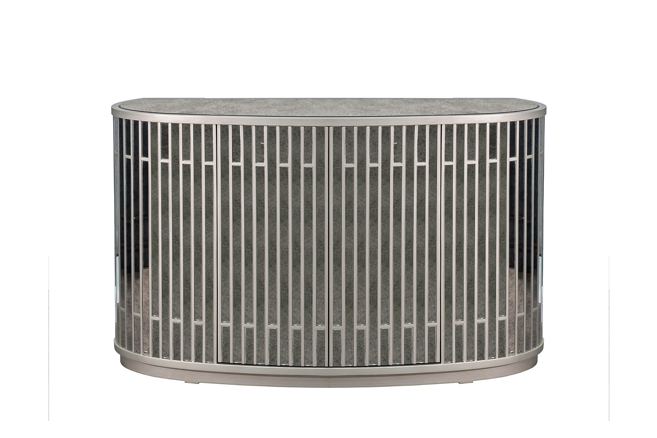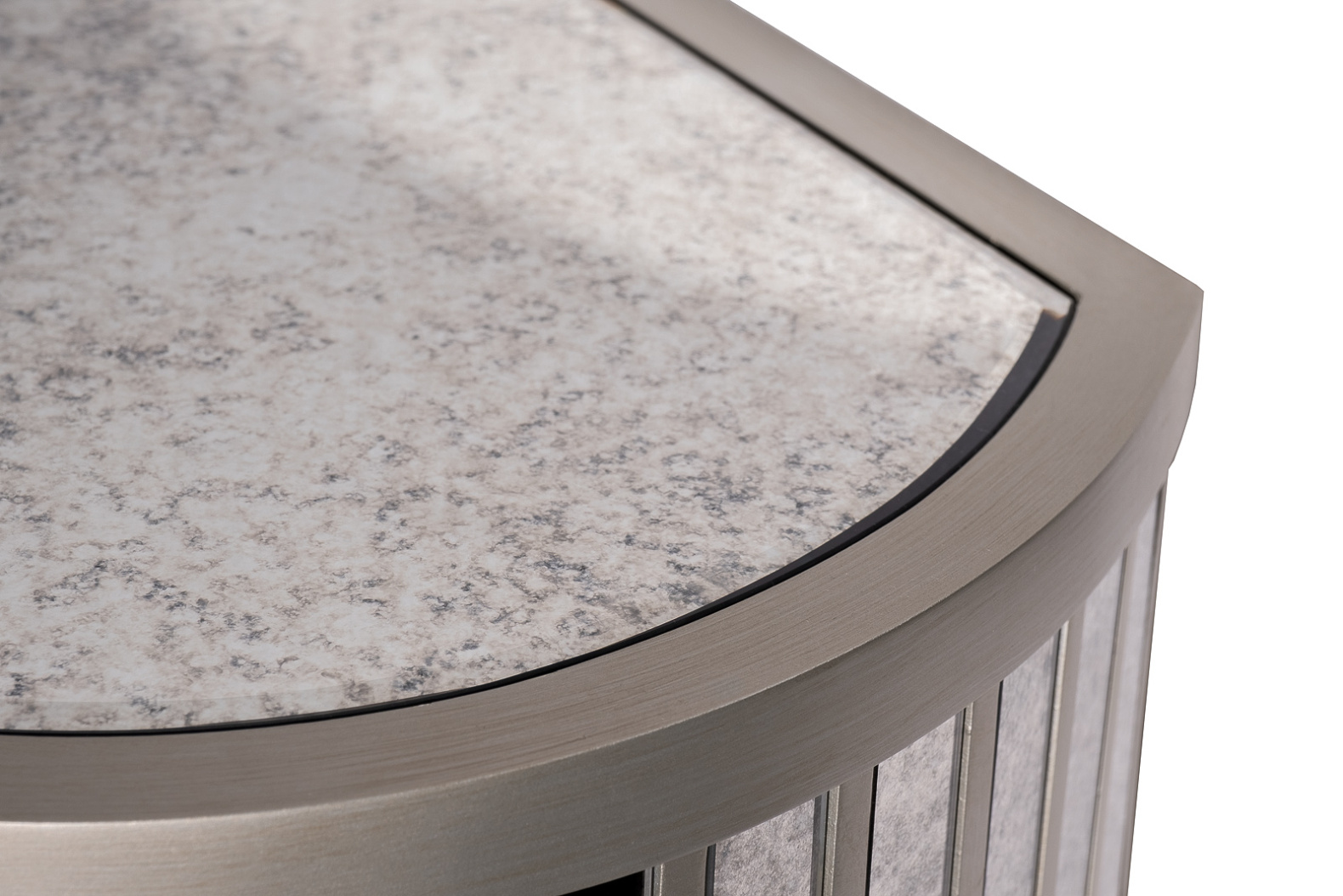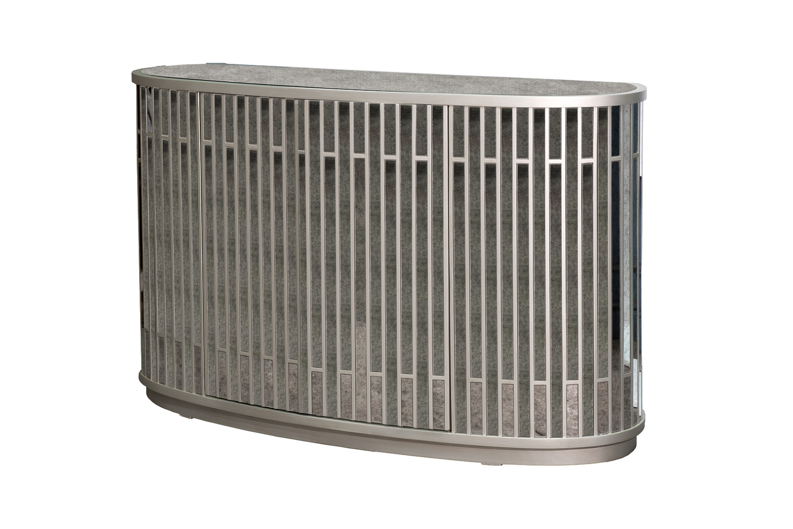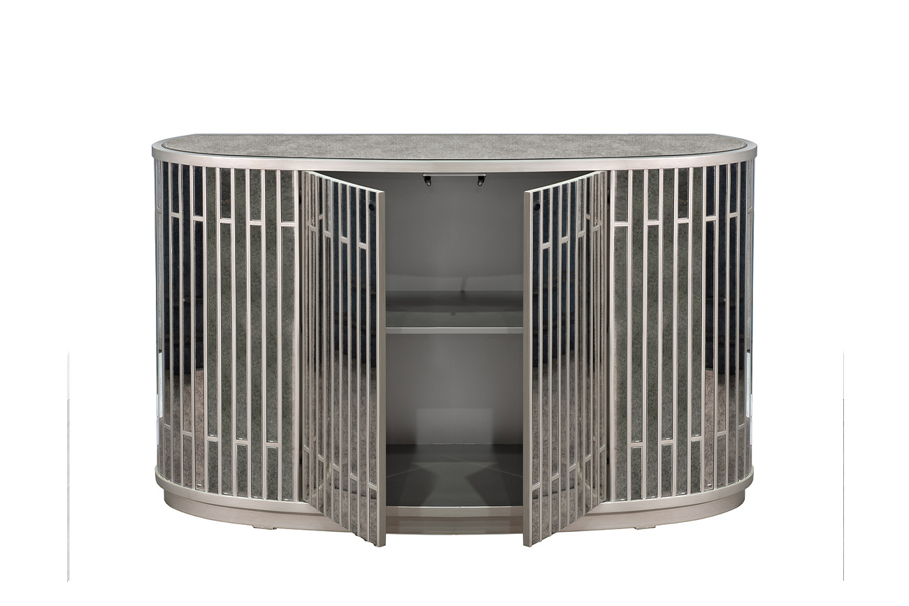 Необычайно изысканный и утонченный комод инкрустирован панелями из искусственно состаренного зеркала цвета silver antique и покрыт зеркальной столешницей того же оттенка. Все детали корпуса из дерева и МДФ серебристого цвета прокрашены и залакированы вручную в несколько слоев, что придает комоду особый шарм и обаяние. Две дверцы с механизмом push-to-open открывают доступ к внутреннему отделению с полкой. Зеркальная столешница может служить красивой подставкой для фоторамок, изысканных безделушек или туалетных принадлежностей. Комод прекрасно впишется даже в устоявшийся интерьер, дополнив меблировку изящной спальной или гостиной комнаты, а также элегантной прихожей.