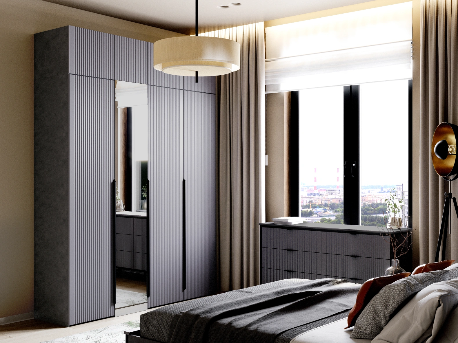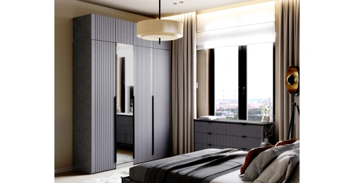 Коллекцию модульной спальни "Нора" отличает современный оригинальный стиль. Декоративная продольная фрезеровка на фасадах из МДФ и опоры на металлокаркасе цвета "Черная эмаль" соответствуют модным тенденциям этого года в ведущих зарубежных коллекциях.