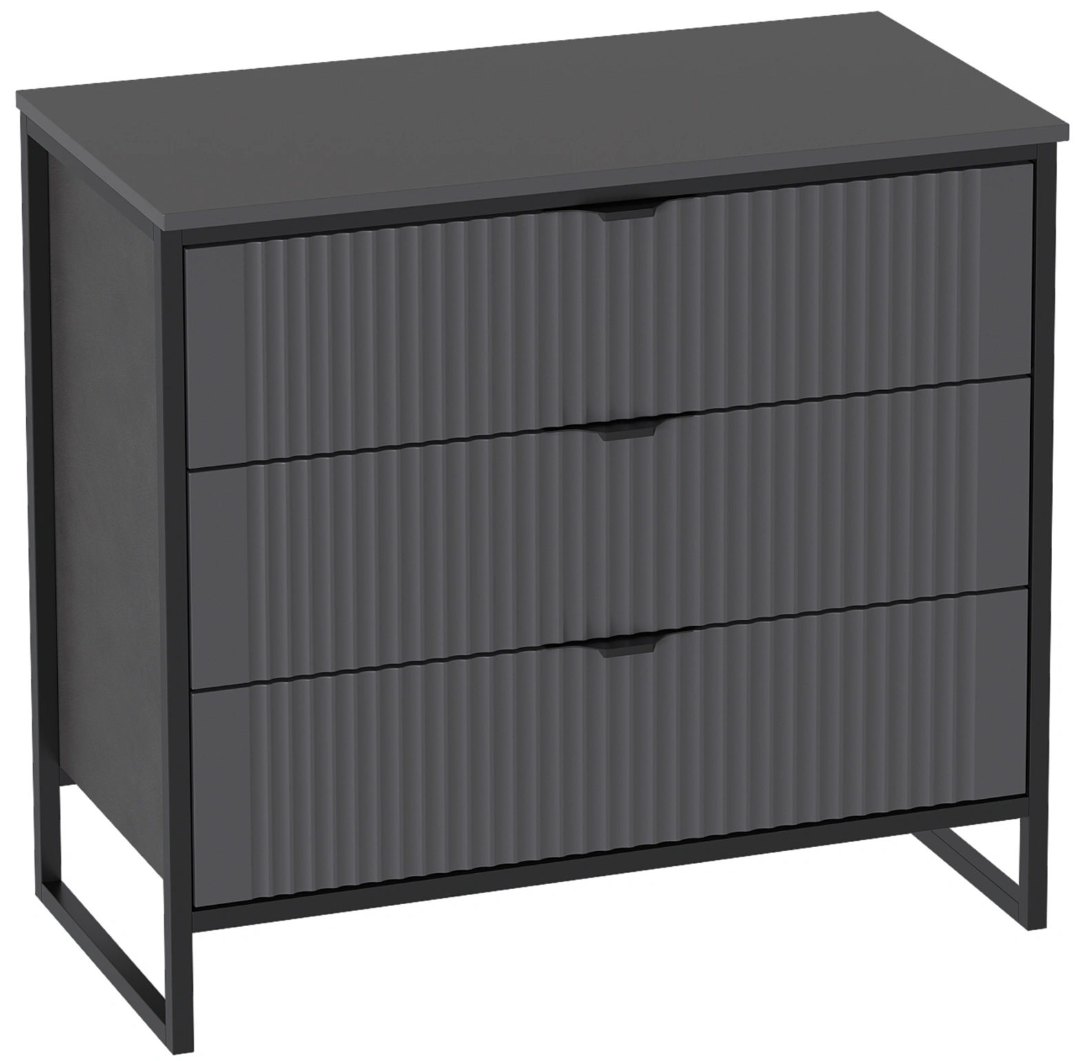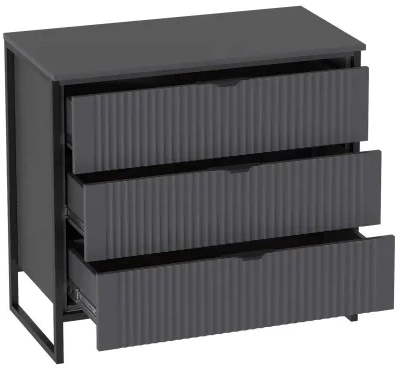 Комод "Нора" на металлокаркасе состоит из трех выдвижных ящиков на шариковых направляющих, что позволяет удобно хранить вещи и поддерживать порядок в комнате. Он выполнен из безопасных, качественных материалов (лдсп и мдф), что гарантирует долговечность и сохранение первоначального вида на протяжении долгого времени.