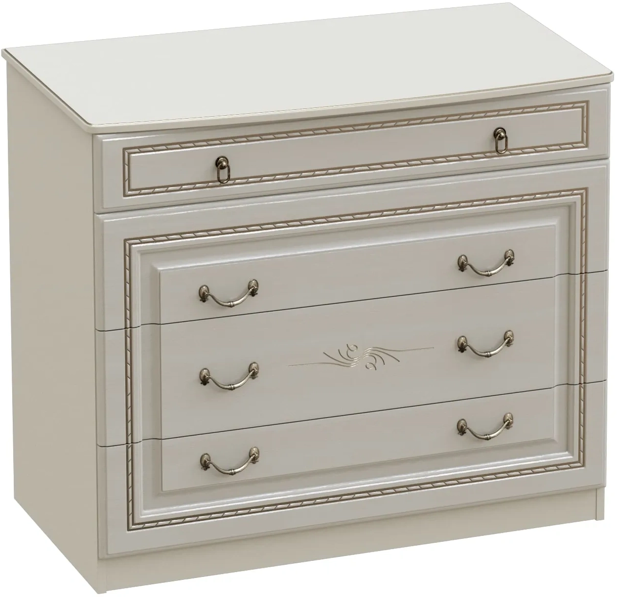 Он отличается роскошным внешним видом и наличием четырех вместительных ящиков. Фасады ящиков декорированы элегантной фрезеровкой с эффектом патины. Для удобства использования ящики оснащены металлическими ручками, имитирующими ковку.