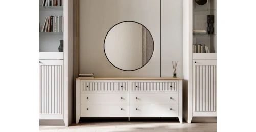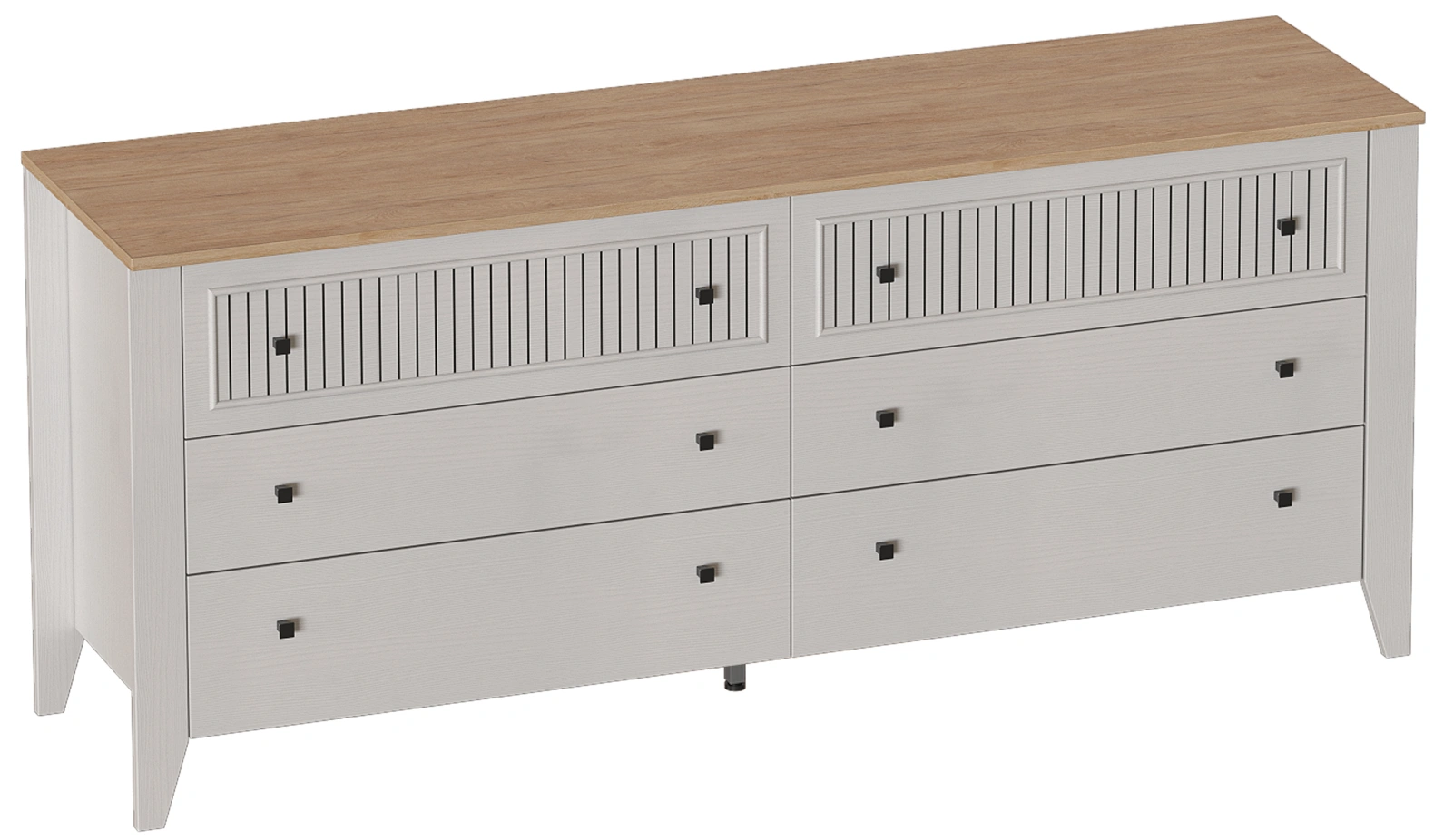 Комод "Валенсия" выполнен в комбинации Дуб натуральный светлый / Персидский жемчуг и состоит из выдвижных ящиков на шариковых направляющих (без амортизаторов), что позволяет удобно хранить вещи и поддерживать порядок в комнате. Он выполнен из безопасных, качественных материалов, что гарантирует долговечность и сохранение первоначального вида на протяжении долгого времени.