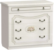 Он отличается роскошным внешним видом и наличием четырех вместительных ящиков. Фасады ящиков декорированы элегантной фрезеровкой с эффектом патины и медальоном, на котором изображены розы. Для удобства использования ящики оснащены темными металлическими ручками, имитирующими ковку.