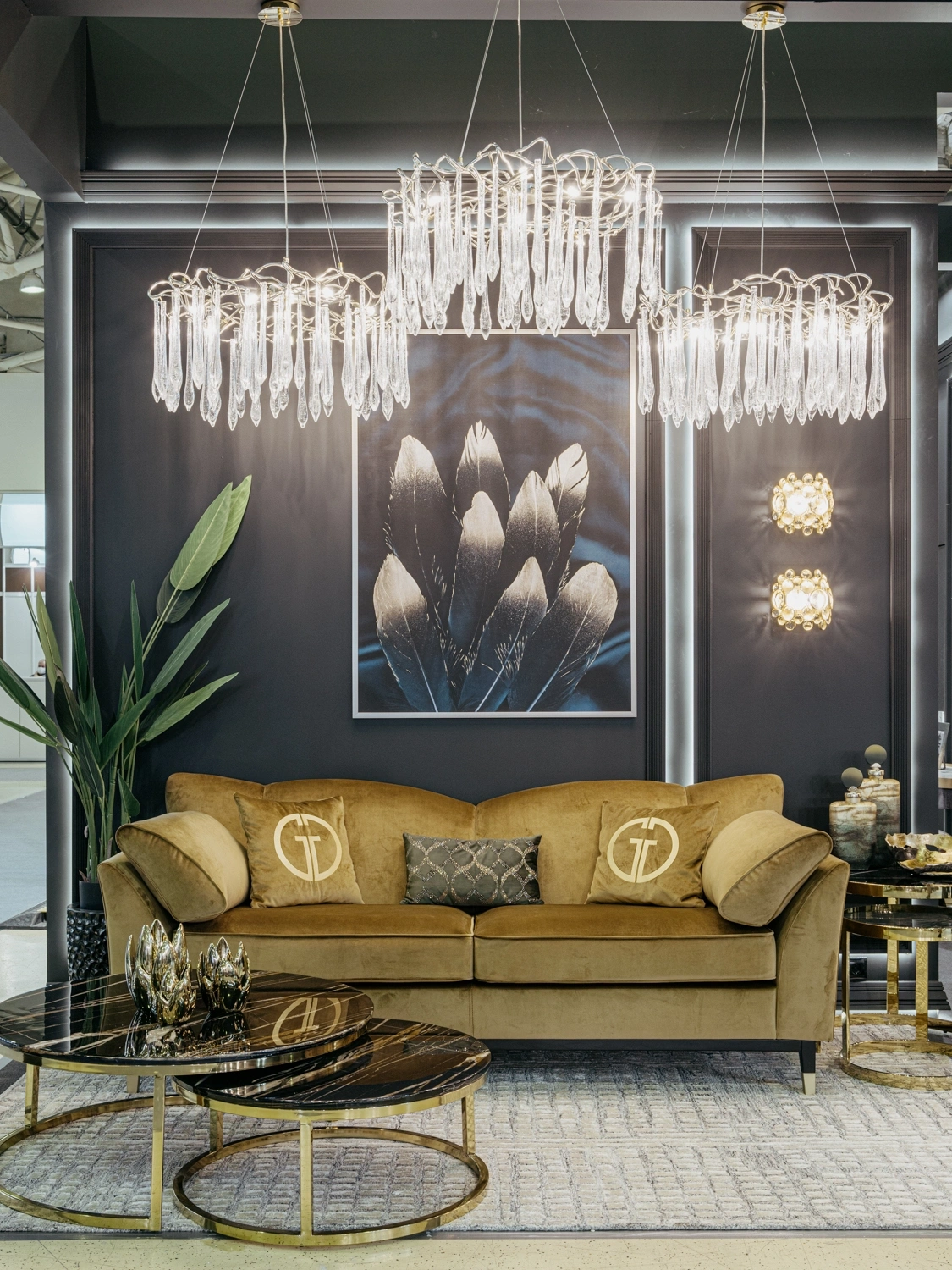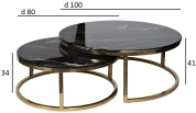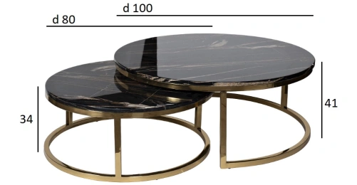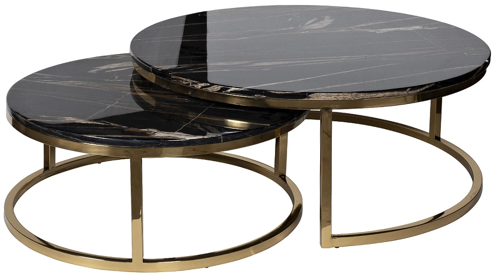 Комплект журнальных столов для гостиной – удачный выбор для гостиной, кабинета или спальной. Эти круглые журнальные столы немного различаются размерами. В результате один из них удобно задвигается под другой, экономя пространство. При необходимости столики можно раздвинуть, если у вас намечаются гости. Такой набор журнальных столов выглядит необычайно стильно и презентабельно. Мебель выполнена со вкусом, отвечает современным требованиям качества. Оригинальная опора из полированной нержавеющей стали золотого цвета эффектно сочетается со столешницей из черного искусственного мрамора с цветными прожилками.