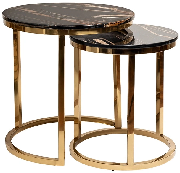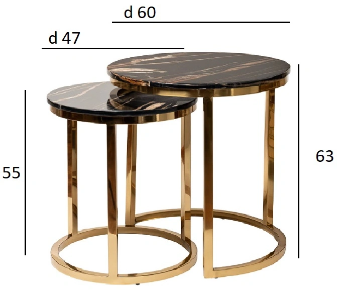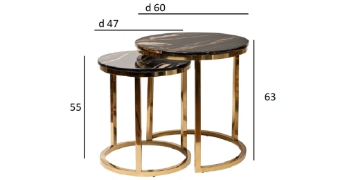 Стильный комплект журнальных столиков станет отличным выбором для гостиной, кабинета, спальни. Конструкция модели весьма интересная – два журнальных столика различны по размерам, поэтому меньший легко задвигается и экономит пространство. При необходимости вы получаете сразу два стола, а значит в два раза больше места для сервировки. Дизайнерский набор журнальных столиков выглядит элегантно и презентабельно за счет сочетания столешниц под мрамор с каркасом из нержавеющей стали золотого цвета. Размеры столов - 60х60х63, 47х47х55.