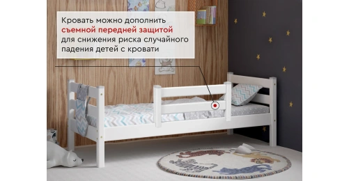 Кровать можно дополнить съемной передней защитой для снижения риска случайного падения детей с кровати. Матрас и выдвижные ящики приобретаются отдельно.