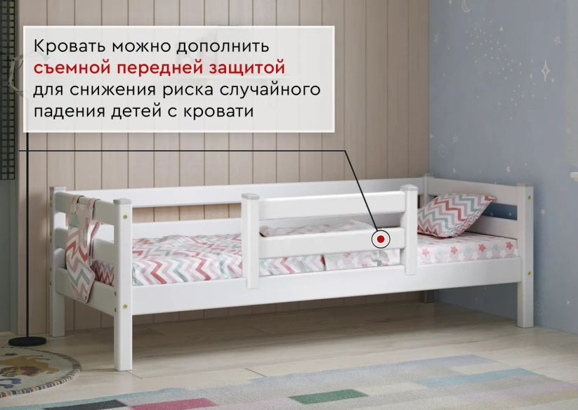 Кровать можно дополнить съемной передней защитой (пакет №5) для снижения риска случайного падения детей с кровати. Матрас и выдвижные ящики приобретаются отдельно.