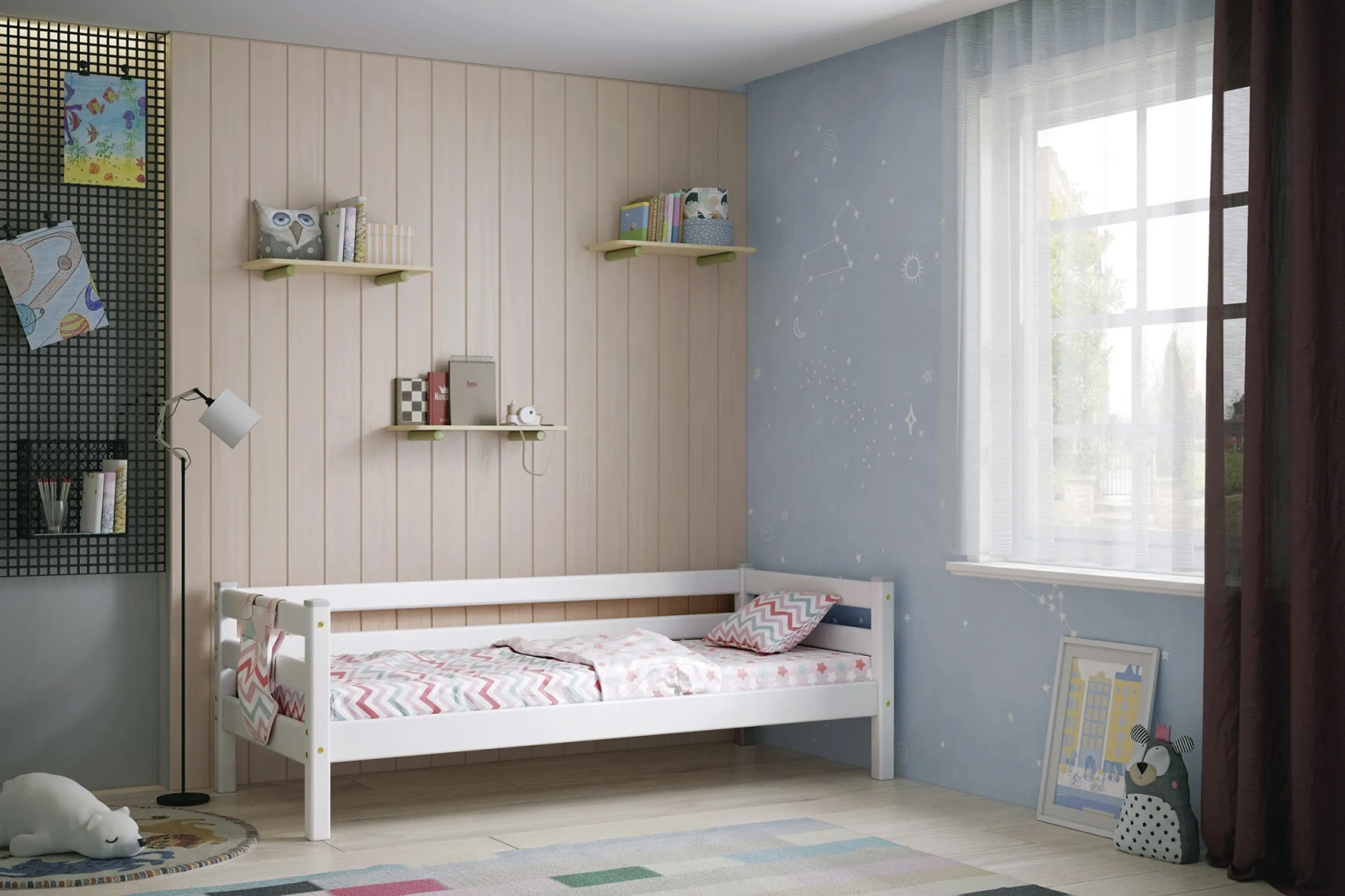 Вариант 2. Кровать "Соня" с задней защитой — один из примеров идеального сочетания практичности, оригинальности и долговечности. Цветовое исполнение подходит сразу для нескольких стилей, а габариты — для комнат разной площади. Мебель для детской создается из безопасных материалов с отличной износостойкостью.