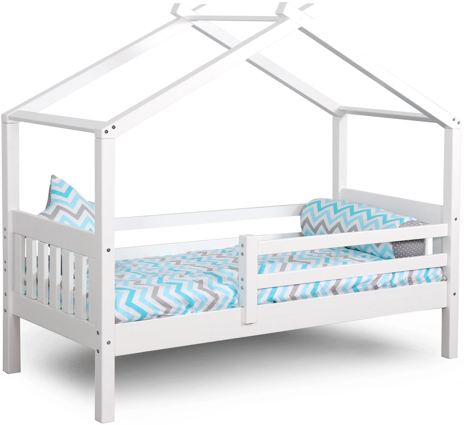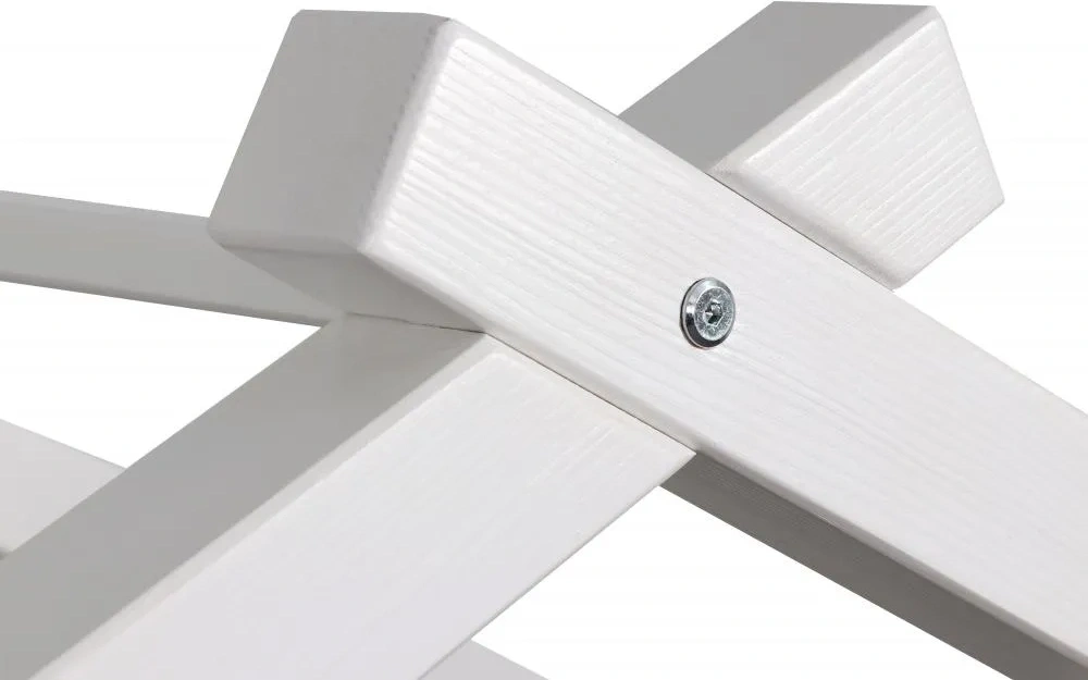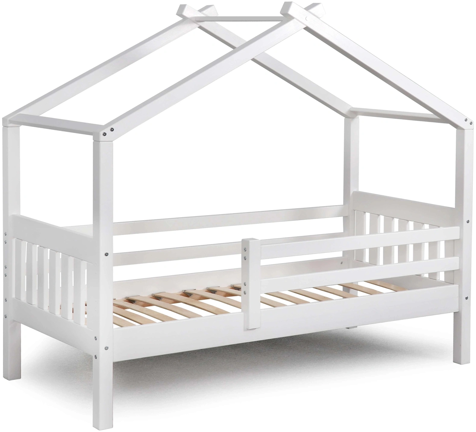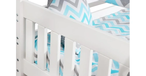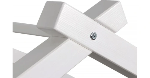 Каркас укомплектован основанием из поперечных гнутых ламелей. Головная и ножная спинки соединены стропилами, образующими крышу: если дополнить кроватку текстильными аксессуарами в виде балдахина и мягких бортиков, малыш будет ощущать себя в собственном уютном домике. В комплектацию кровати входит ортопедическое основание из гнутоклееных ламелей.