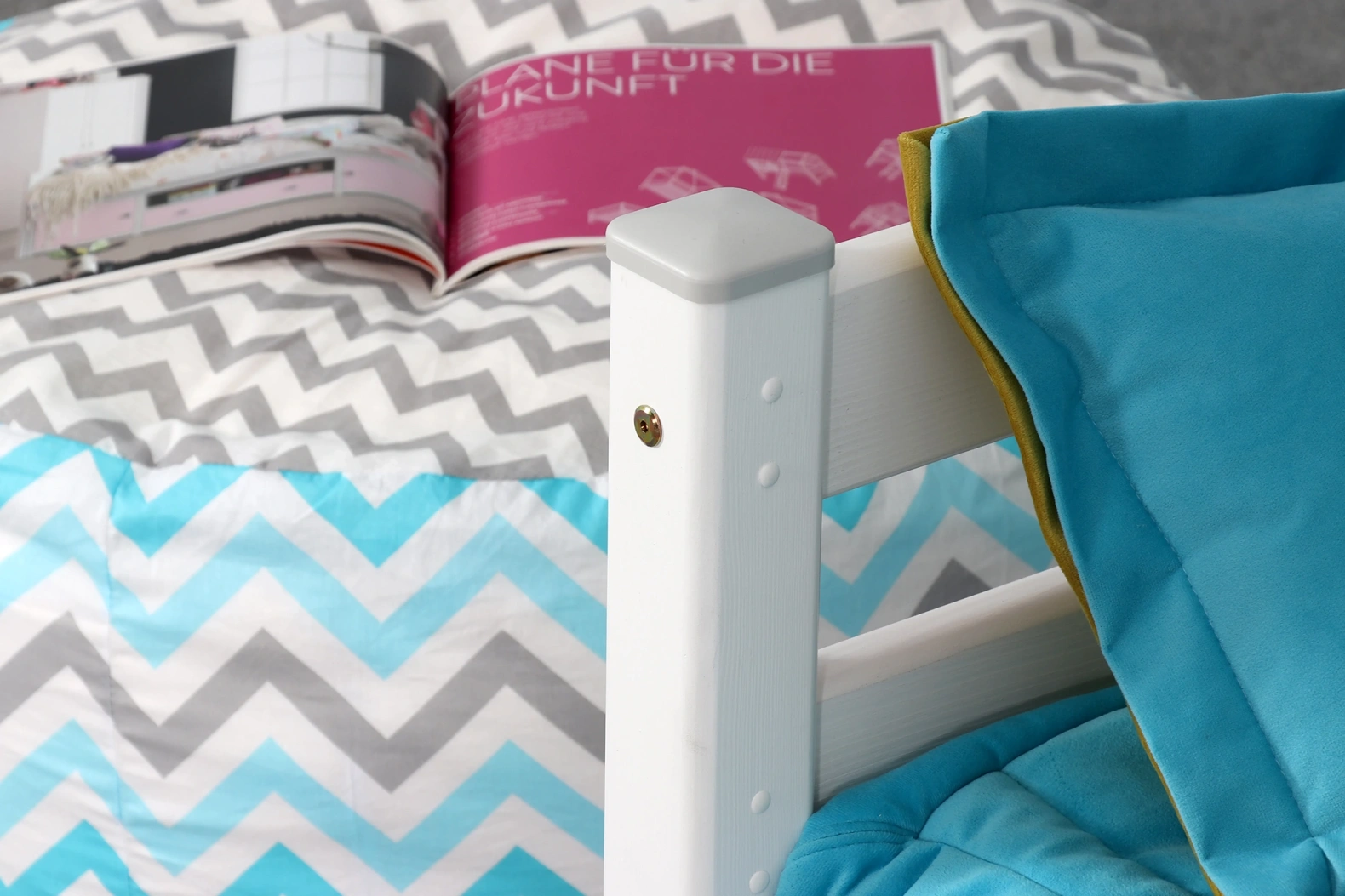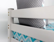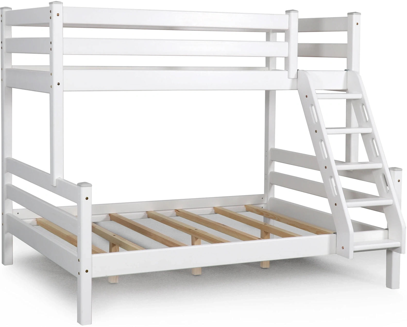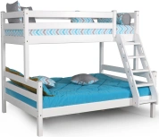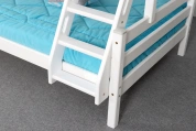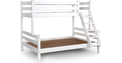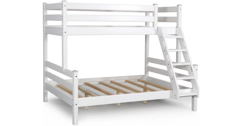 Увеличенное до 120 см по ширине спальное место нижнего яруса подходит для подростка, чей вес не превышает 70 кг. Верхнее основание имеет вид гнутых ламелей, с усиливающей перемычкой по периметру, нижнее представлено опорными брусками с уложенным поверх них настилом из шлифованного МДФ 10мм. Массив сосны подвергнут тщательной шлифовке и покрыт безопасным лаком на водной основе.