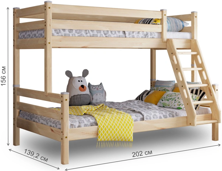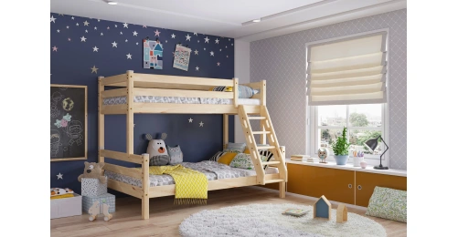 Увеличенное до 120 см по ширине спальное место нижнего яруса подходит для подростка, чей вес не превышает 70 кг. Верхнее основание имеет вид гнутых ламелей, с усиливающей перемычкой по периметру, нижнее представлено опорными брусками с уложенным поверх них настилом из шлифованного МДФ 10мм. Массив сосны подвергнут тщательной шлифовке и покрыт безопасным лаком на водной основе.