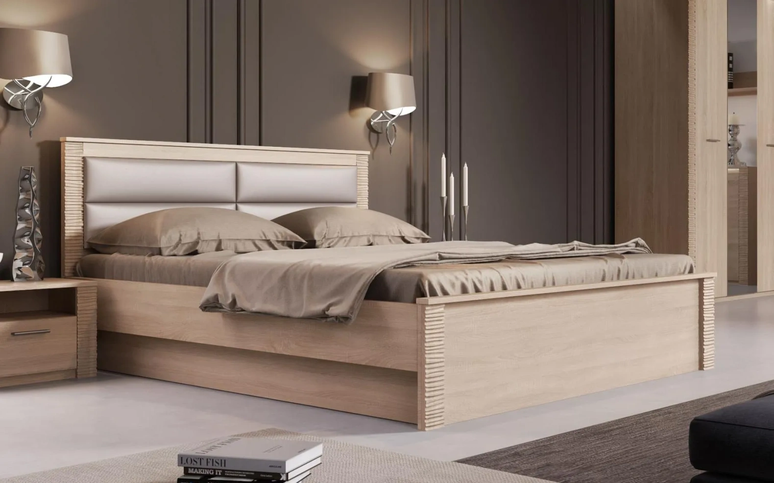 Кровать оснащена мягким изголовьем, состоящим из четырёх элементов, обтянутых экокожей.