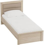 Кровать оснащена мягким изголовьем, состоящим из четырёх элементов, обтянутых экокожей.