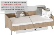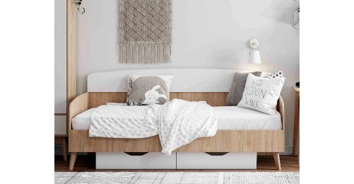 Кровать стоит на опорах из массива березы. Основанием матраса является настил из ЛДСП, закрепленный на стойках. Дополнительно может комплектоваться выкатным ящиком на роликовых опорах.