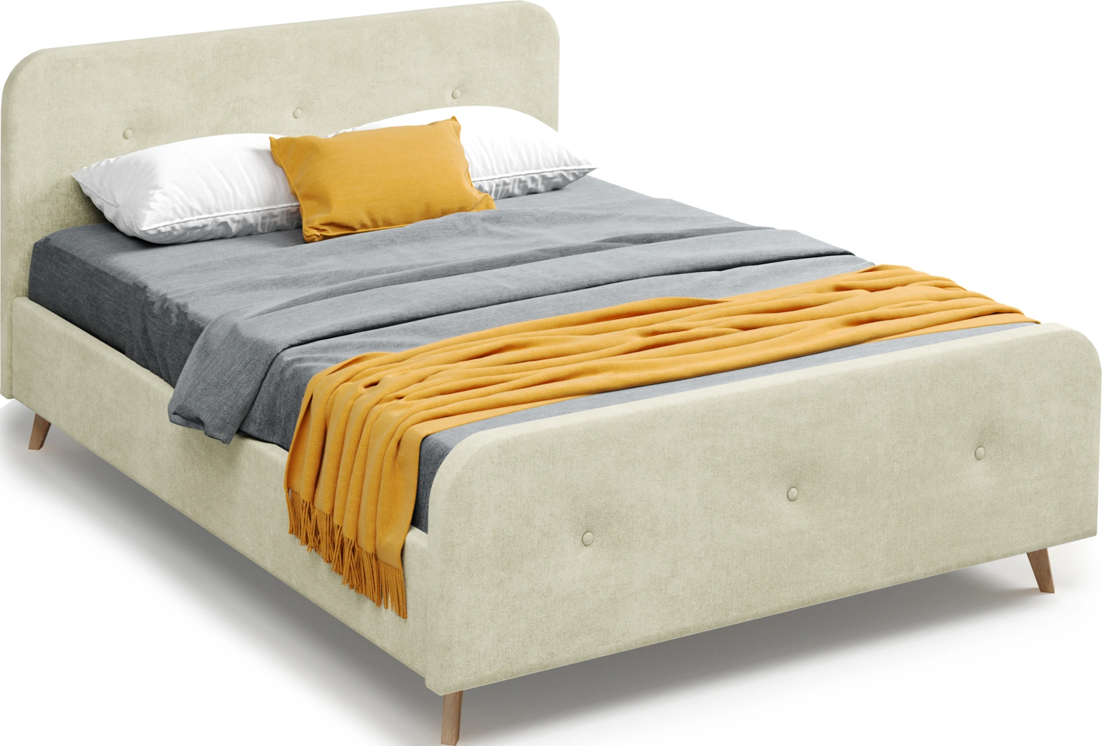 Изголовье имеет закругленный силуэт, обтянут велюровой тканью с пуговицами, что обеспечивает дополнительную мягкость и уют. Высокие стильные ножки из массива березы создадут ощущение легкости и воздушности.