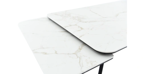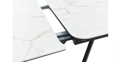 Кухонный стол «Leon» со столешницей из искусственного камня, материал - керамогранит Calacata vaglioro, на черных металлических опорах. Отличительной чертой этого стола являются изогнутые ножки и синхронный механизм для раскладки стола с подъемным механизмом. Такой механизм успешно себя зарекомендовал и пользуется постоянным спросом у наших покупателей.