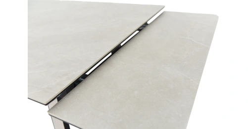 Кухонный стол «Monaco» Quadro, со столешницей из искусственного камня, материал - керамогранит Bayona ivory natural, на черных металлических опорах. Отличительной чертой этого стола являются боковые вставки для раскладки стола. Такой механизм успешно себя зарекомендовал и пользуется постоянным спросом у наших покупателей. На вставках опор, также используется керамогранит. Стоит отметить еще одну особенность стола «Monaco» Quadro — это выбор, как со столешницей из керамогранита, так и покрытия из закаленного, матового стекла OPTI. На столы с керамикой, между столешницей и вставкой, приклеивается силиконовая полоска, она необходима для сохранения целостности керамики при трансформации стола. Ее необходимо оставить!