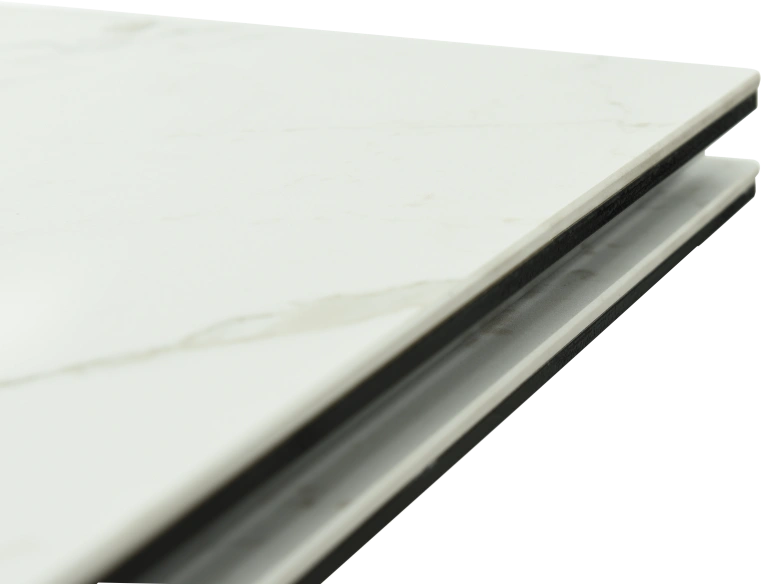 Кухонный стол «Monaco» Quadro, со столешницей из искусственного камня, материал - керамогранит Calcata vaglioro, на черных металлических опорах. Отличительной чертой этого стола являются боковые вставки для раскладки стола. Такой механизм успешно себя зарекомендовал и пользуется постоянным спросом у наших покупателей. На вставках опор, также используется керамогранит. Стоит отметить еще одну особенность стола «Monaco» Quadro — это выбор, как со столешницей из керамогранита, так и покрытия из закаленного, матового стекла OPTI. На столы с керамикой, между столешницей и вставкой, приклеивается силиконовая полоска, она необходима для сохранения целостности керамики при трансформации стола.