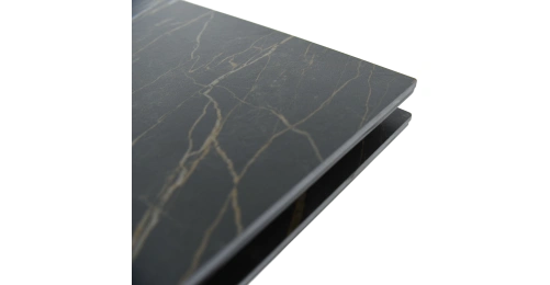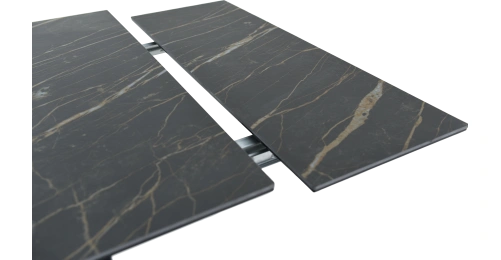 Кухонный стол «Monaco» Quadro, со столешницей из искусственного камня, материал - керамогранит Noir desir Bocciardato, на черных металлических опорах. Отличительной чертой этого стола являются боковые вставки для раскладки стола. Такой механизм успешно себя зарекомендовал и пользуется постоянным спросом у наших покупателей. На вставках опор, также используется керамогранит. Стоит отметить еще одну особенность стола «Monaco» Quadro — это выбор, как со столешницей из керамогранита, так и покрытия из закаленного, матового стекла OPTI. На столы с керамикой, между столешницей и вставкой, приклеивается силиконовая полоска, она необходима для сохранения целостности керамики при трансформации стола.